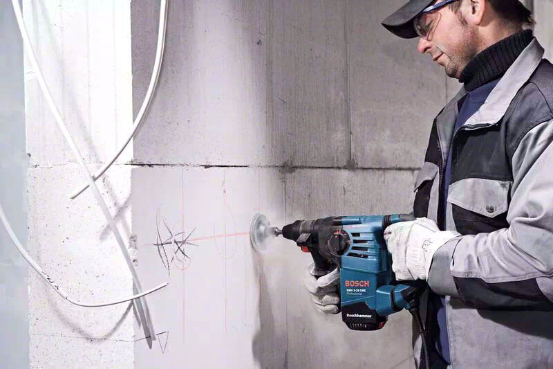Młot udarowo-obrotowy GBH 3-28 DRE Bosch pozwala wiercić 20% szybciej i gwarantuje maksymalną wydajność kucia. Narzędzie zaprojektowane zostało na kształt litery L, dzięki czemu umożliwia równomierne rozłożenie ciężaru, a co za tym idzie większy komfort podczas pracy. Młotowiertarka pozwala na pracę w 3 trybach - wiercenia, wiercenia z udarem i kucia. Możliwość zablokowania udaru ułatwia wykonywanie otworów w drewnie i metalu, a wyłączenie obrotów usprawnia dłutowanie.