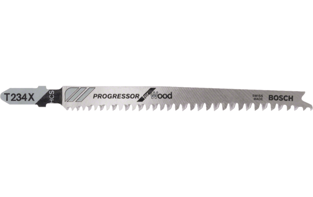 Brzeszczot T 234 X Progressor for Wood o długości 117mm pozwala na czyste proste cięcie cienkiego i grubego drewna. Ostrze wykonane ze stali wysokowęglowej sprawdzi się idealnie przy cięciu miękkiego drewna i nieściernych materiałów drewnianych. Brzeszczot umożliwia pracę z szerokim zakresem gęstości materiałów, dzięki geometrii zębów ze stopniowo rosnącą podziałką. Ponadto kombinacja stożkowo szlifowanego grzbietu ostrza, precyzyjnego oszlifowania zębów oraz japońskiej geometrii wielokrotnego szlifowania zębów gwarantuje wyjątkowo czyste cięcie. Podziałka uzębienia 2 - 3 mm pozwala na cięcie różnorodnych materiałów drewnianych o grubości od 3 do 65mm. Przeznaczony do stosowania z wyrzynarkami z uchwytem T.