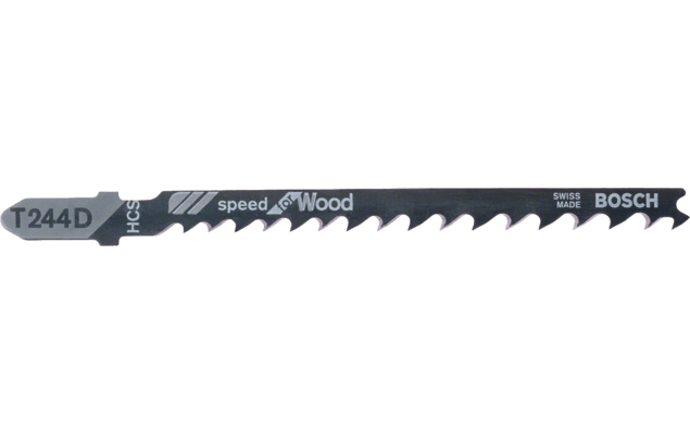 Brzeszczot T 244 Speed fo Wood o długości 100mm gwarantuje szybkie cięcie krzywoliniowe. Posiada ostro szlifowane, rozwarte zęby oraz wąskie ostrze dla wydajnego i sprawnego cięcia. Duża, stopniowana podziałka uzębienia 4 - 5,2 mm pozwala na cięcie różnych materiałów drewnianych o grubości od 5 do 50mm. Wykonany został ze stali wysokowęglowej, co umożliwia szybkie cięcie drewna miękkiego i nieściernych materiałów drewnianych przy użyciu wyrzynarek z uchwytem T.