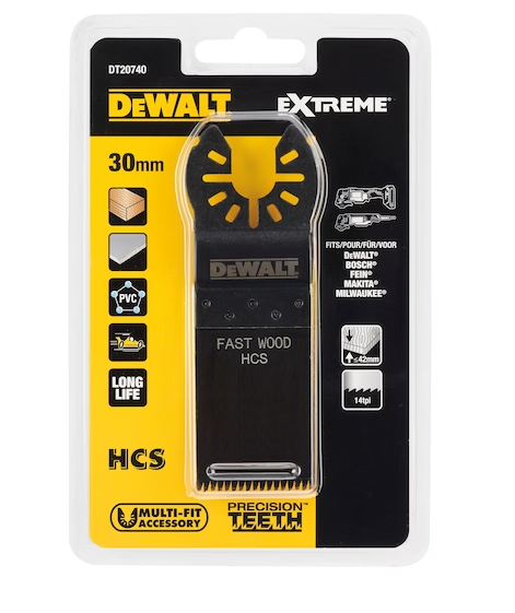 Brzeszczot DeWalt z serii Extreme do narzędzia wielofunkcyjnego/piły japońskiej o szerokości 32 mm. Przeznaczony do przecinania twardego drewna.