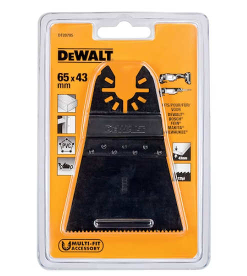 Brzeszczot DeWalt przeznaczony jest do użytkowania z urządzeniami wielofunkcyjnymi DeWalt oraz urządzeniami marek Fein, Bosch, Makita i Milwaukee. Brzeszczot bimetalowy o wymiarach 43 x 65 mm umożliwia sprawne precyzyjne cięcie drewna, konstrukcji drewnianych i PCV.