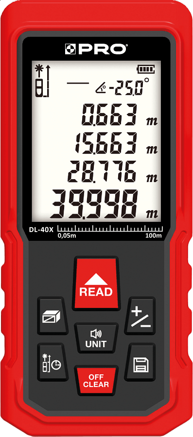 Dalmierz laserowy DL-X Pro przeznaczony jest do pomiarów odległości, powierzchni oraz kubatury wybranego produktu i umożliwia pracę w zakresie od 0,05m do 40m. Dalmierz Pro posiada podświetlany ekran LCD oraz antypoślizgowe przyciski. Wyposażony został w funkcję pomiaru ciągłego, dynamicznego oraz pośredniego - wzbogaconego o możliwość obliczania sumy i różnicy.