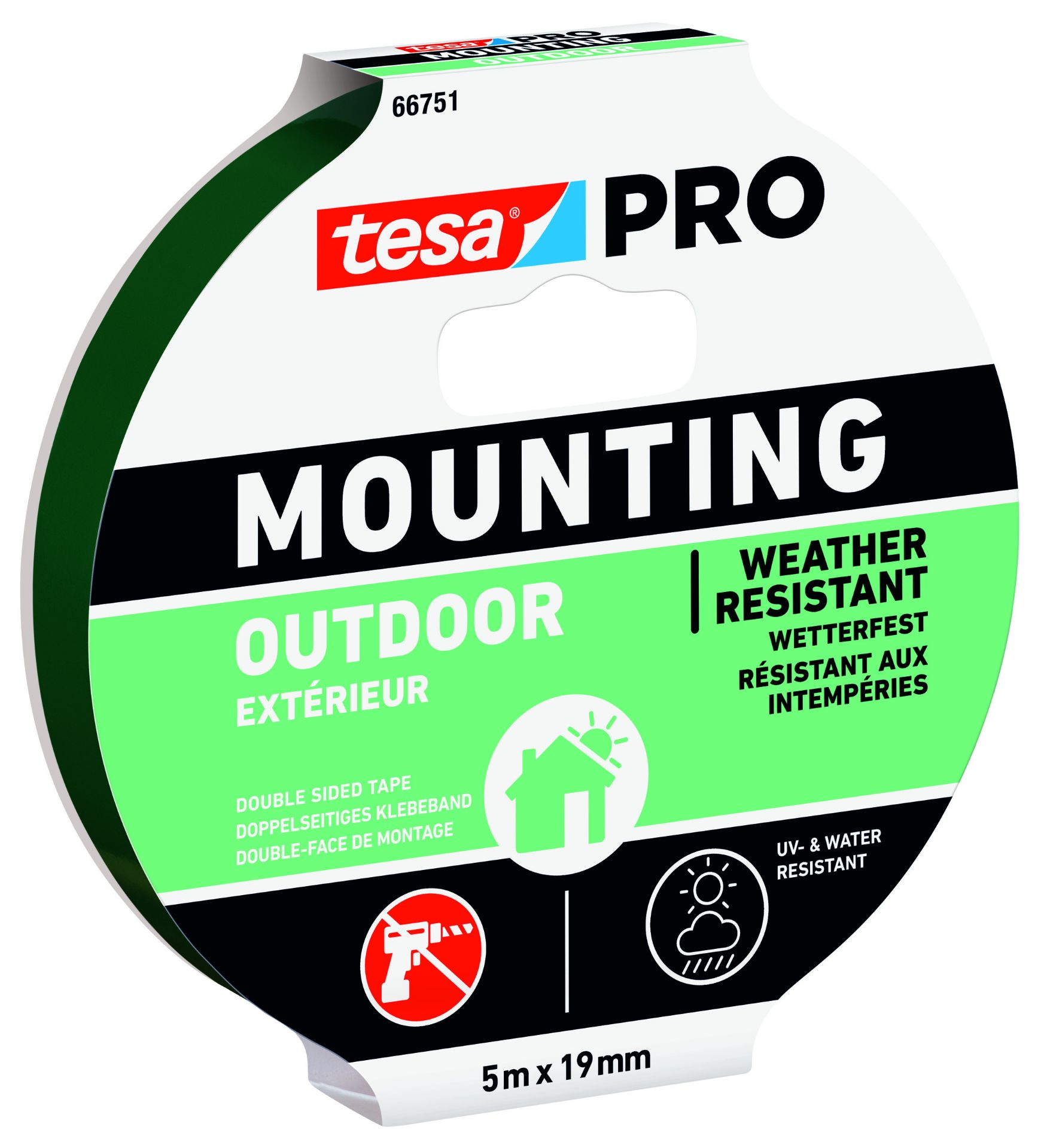 Dwustronna taśma montażowa tesa PRO Mounting o długości 5 m i szerokości 19 mm, do zastosowań na zewnątrz.
