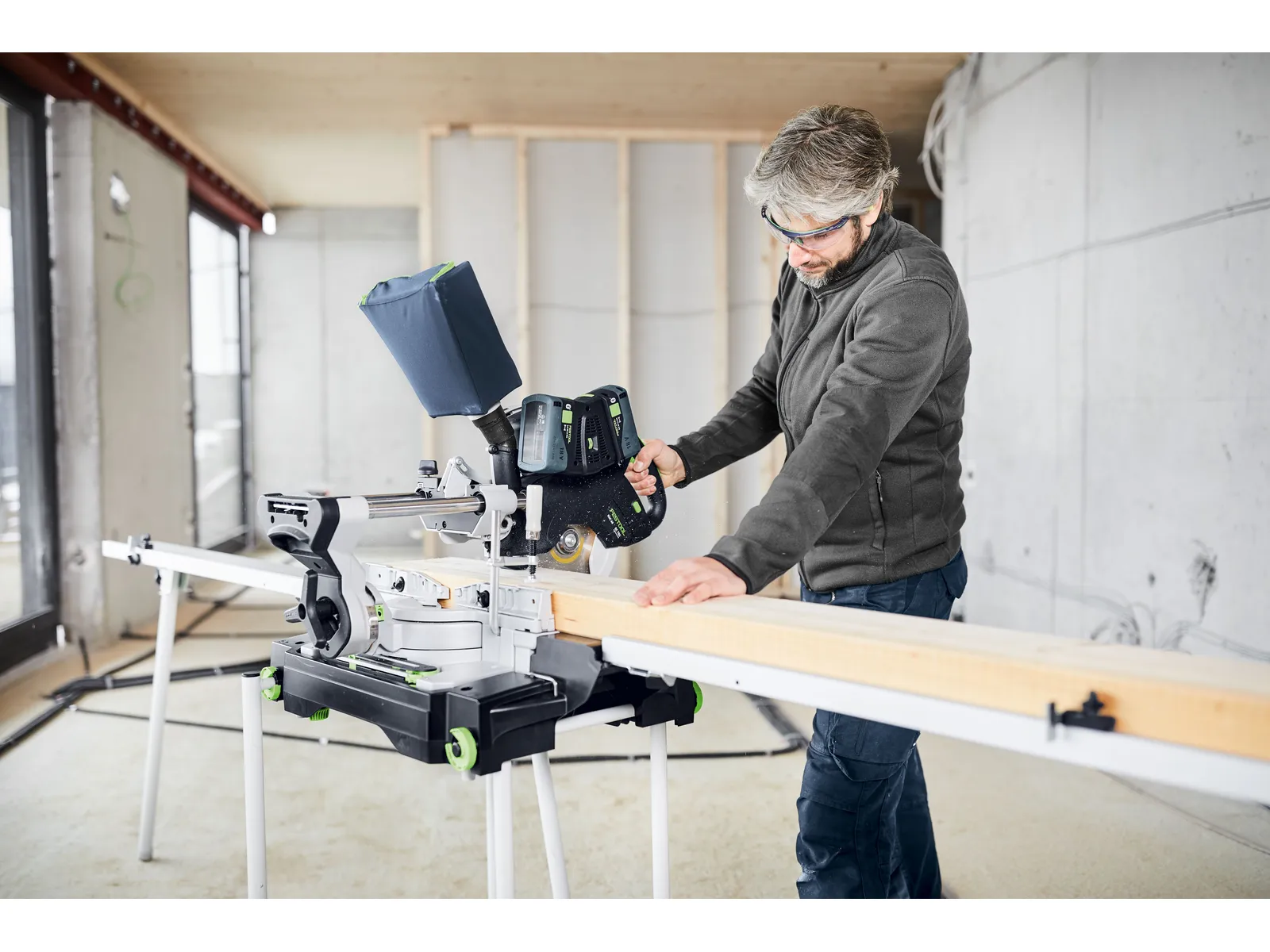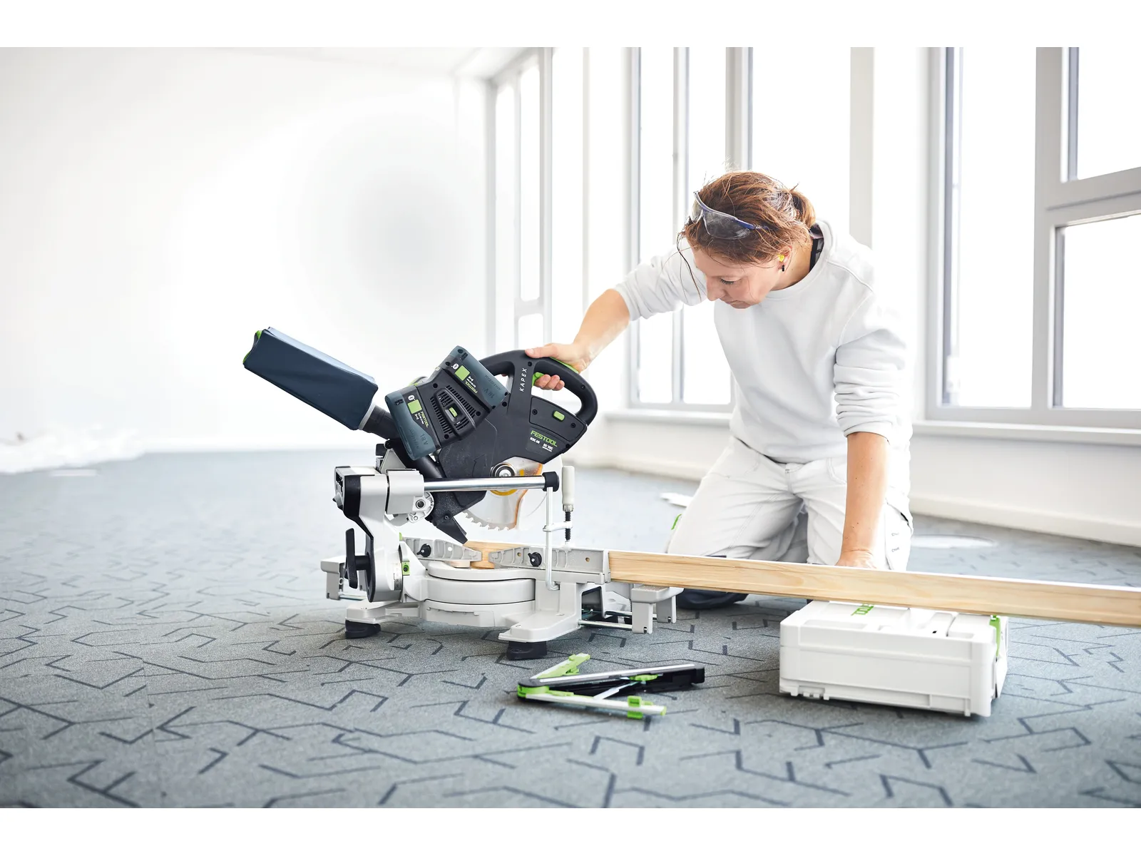 Akumulatorowa ukośnica przesuwna KAPEX KSC 60 charakteryzuje się niewielkim ciężarem i kompaktową konstrukcją, co w połączeniu z komfortowymi uchwytami pozwala na wygodną pracę w każdych warunkach. Wyposażona została w bezszczotkowy silnik EC-TEC, który w połączeniu z systemem podwójnych akumulatorów zapewnia maksymalną wytrzymałość we wszystkich typowych zastosowaniach. Urządzenie posiada dwukolumnową prowadnicę z podwójnym ułożyskowaniem dla precyzyjnego i płynnego prowadzenia tarczy pilarskiej. Ponadto obustronne kąty skosu do 60 stopni i obustronne kąty nachylenia od 46 do 47 stopni umożliwiają wszechstronność zastosowań. Ukośnica Festool współpracuje z tarczami o średnicy 216 mm, a możliwość wyboru spośród wielu tarcz pilarskich pozwala na idealne dopasowanie ukośnicy do zadania. Zaletą ukośnicy KAPEX jest także bezpyłowa praca - pojemnik na pył sprawdza się nawet podczas pracy bez odkurzacza.