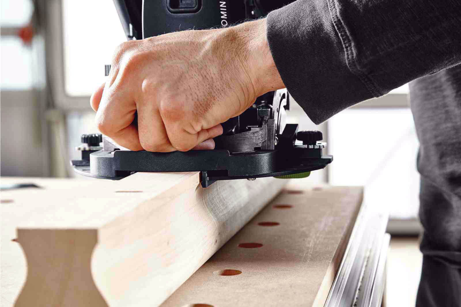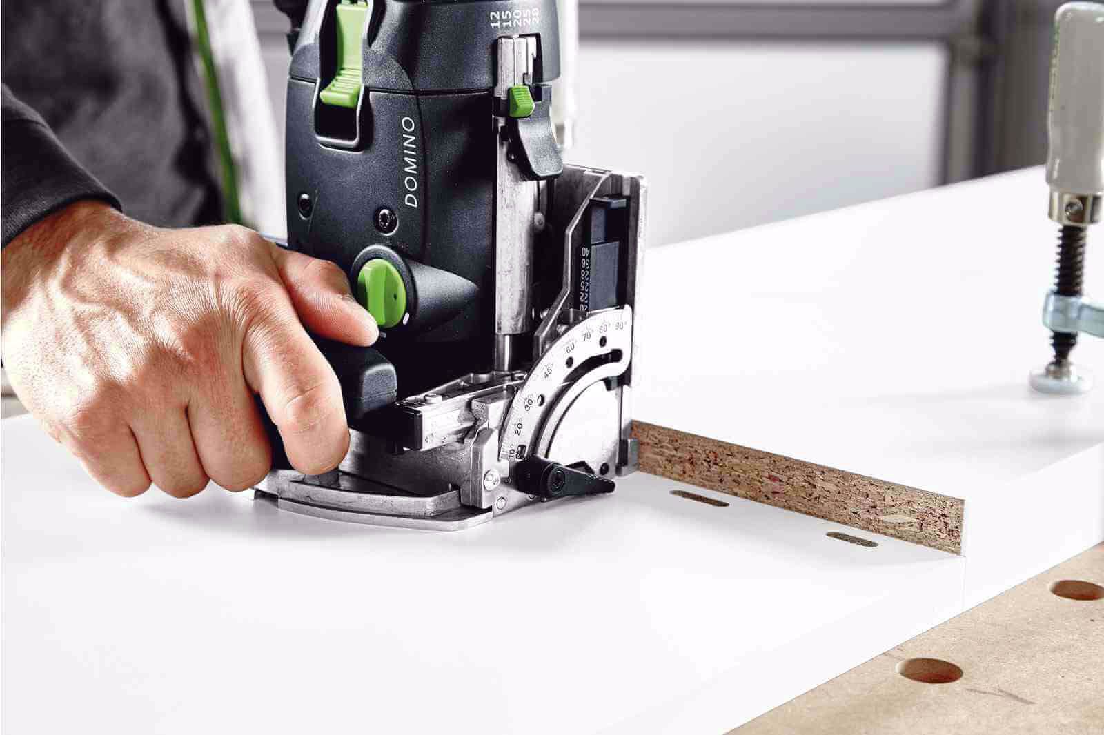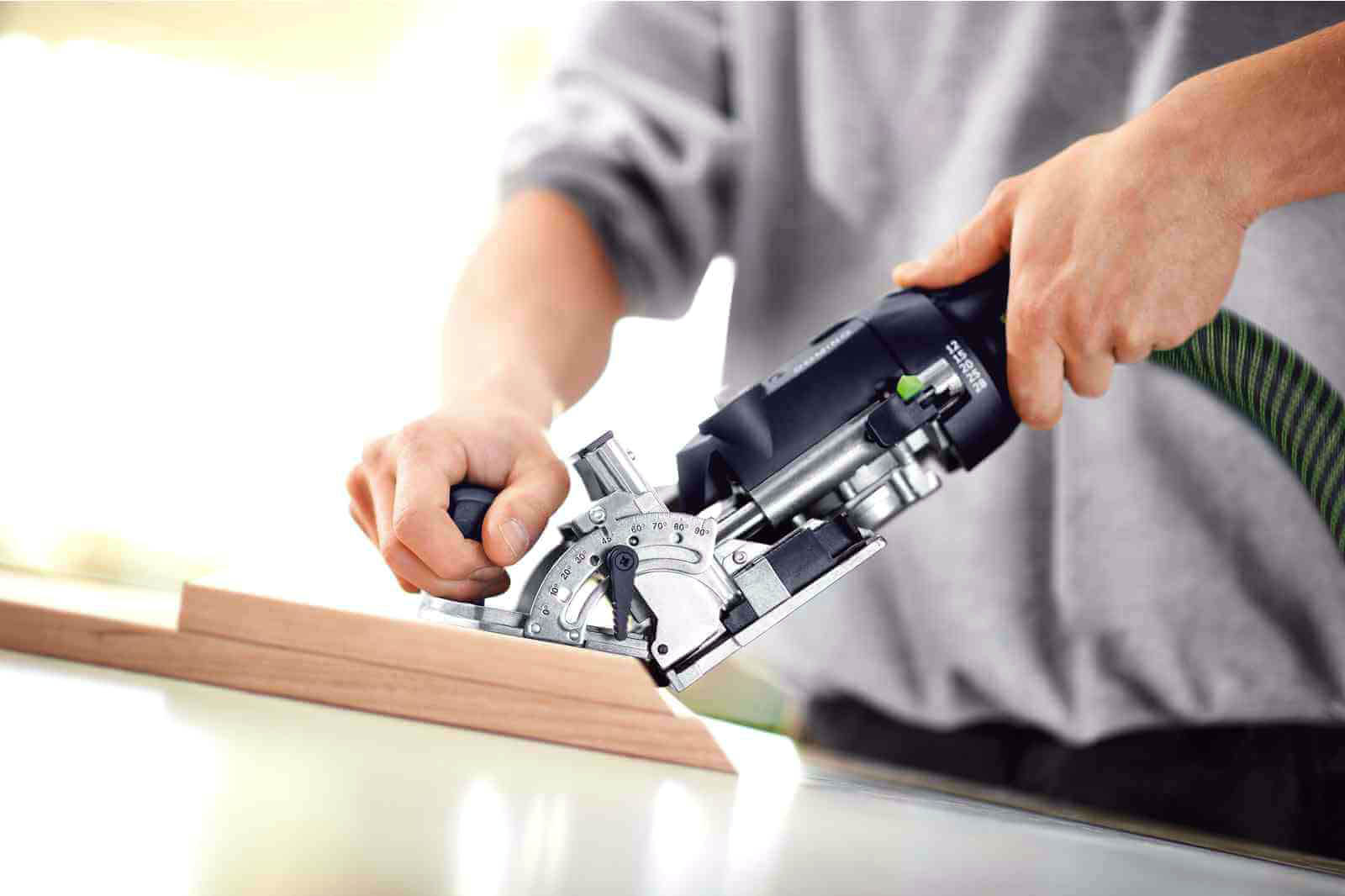 Kolejną zaletą jest oszczędność czasu, dzięki wyeliminowaniu konieczności mierzenia i zaznaczania - frezarka pozwala na szybkie i dokładnie pozycjonowanie, dzięki ogranicznikom. DF 500 umożliwia też blokadę z oznaczoną wartością frezowania dla powtarzalnych głębokości - 12 mm, 15 mm, 20 mm, 25 mm i 28 mm. Korzystając z ustawień pośrednich z łatwością wykonamy frezowanie ukosowe lub bezstopniowo ustawimy kąt frezowania.