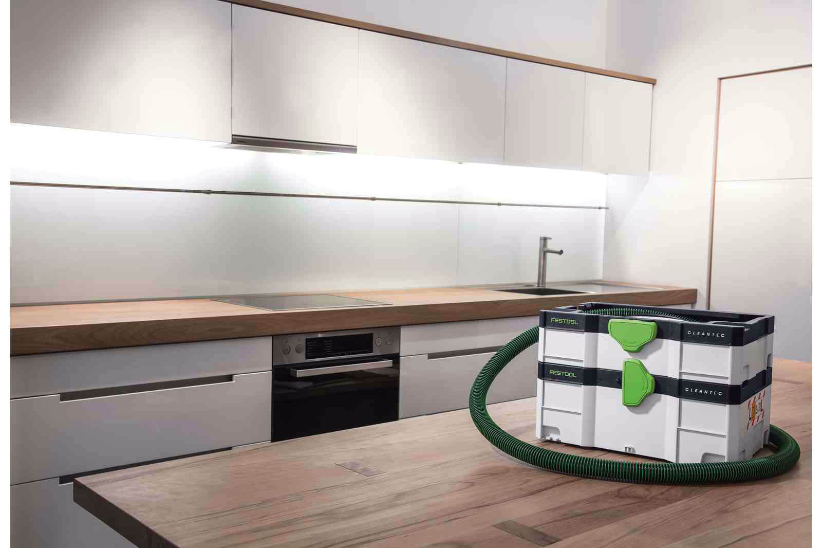 Odkurzacz CLEANTEC CTL SYS Festool przeznaczony do odsysania na sucho w formacie Systainera zapewnia maksymalną mobilność. Ten odkurzacz sprawdzi się idealnie do szybkiego użycia przy mniejszych pracach montażowych i serwisowych. Jego kompaktowe rozmiary pozwalają na wygodne przewieszenie przez ramię, dzięki czemu ręce pozostają wolne. Urządzenie wyposażone zostało w nowy wąż - gładki, elastyczny i wytrzymały, którego stożkowy kształt zapewnia większą moc odsysania. Ponadto wąż można schować w zdejmowanym schowku, dzięki czemu podczas transportu nic nie wystaje i o nic nie zaczepia. Wyciągnięcie filtra w celu wyczyszczenia odbywa się za pomocą jednego przycisku. Zaletą odkurzacza Clenatec CTL SYS jest jego cicha praca - poziom hałasu wynosi zaledwie 67 dB. Urządzienie umożliwia pracę z maks. przepływem powietrza 3000 l/min oraz maks. podciśnieniem 20 000 Pa. Odsysanie w trudno dostępnych miejscach ułatwi dysza do szczelin oraz do obić, znajdujące się w zintegrowanym Systainerze odkurzacza.