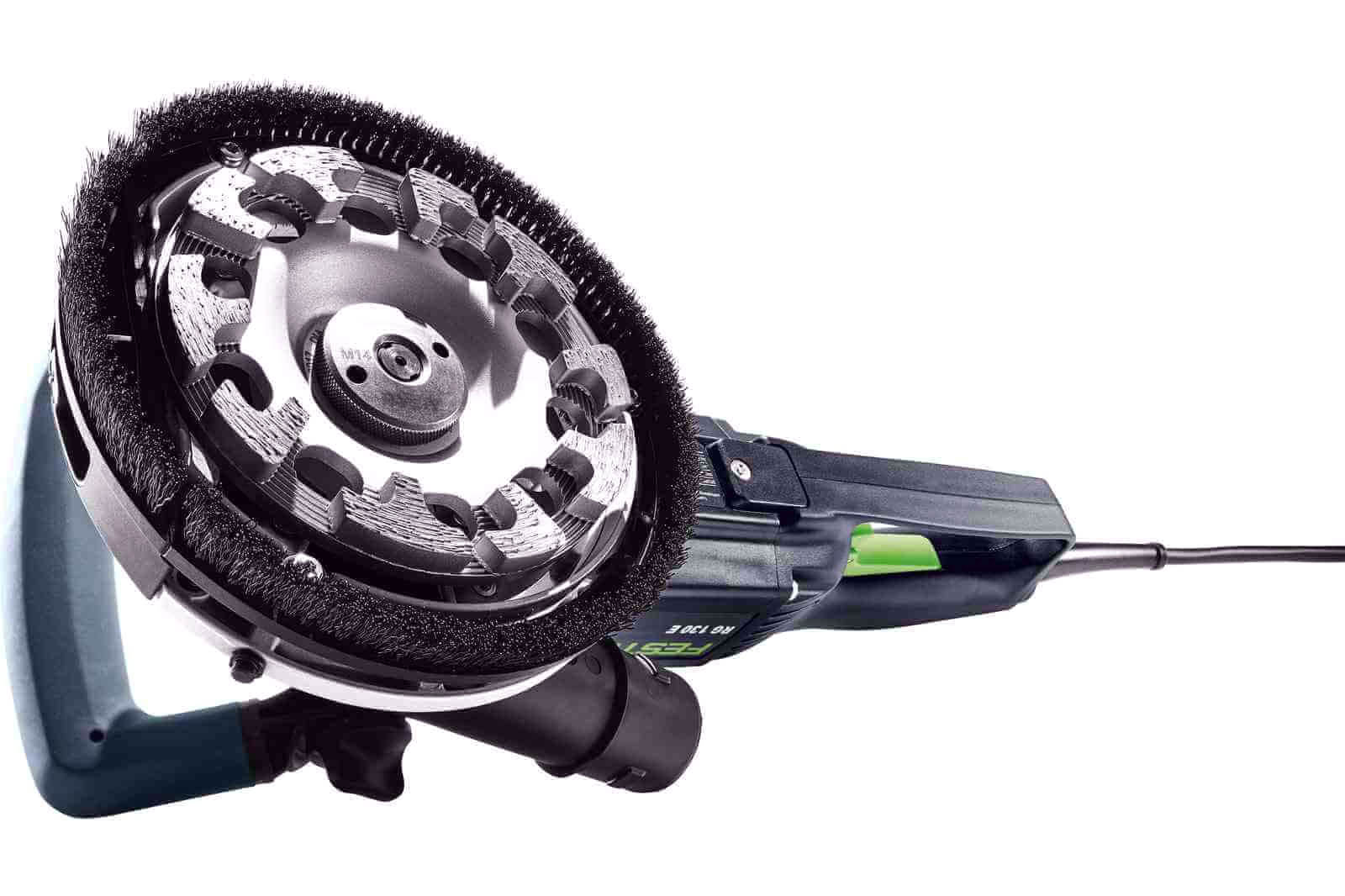 Zdecydowaną zaletą szlifierki RG 130 E-Set jest optymalne prowadzenie, dzięki stołowi prowadzącemu i możliwości regulacji wysokości usuwania materiału. Ponadto, dzięki cofnięciu krążka diamentowego o 0,5 mm składany segment szczotkowy szlifierki pozwala usuwać pozostałości kleju bezpośrednio przy ścianie i uniknąć uszkodzenia ścian. Wieniec szczotkowy szlifierki idealnie dopasowuje się do szlifowanej powierzchni i gwarantuje skuteczne odsysanie - dla bezpyłowej pracy w trosce o zdrowie.