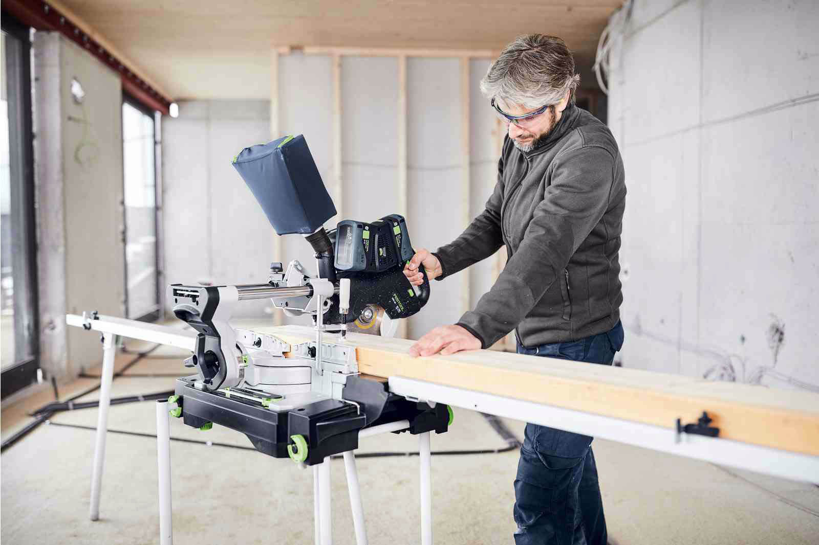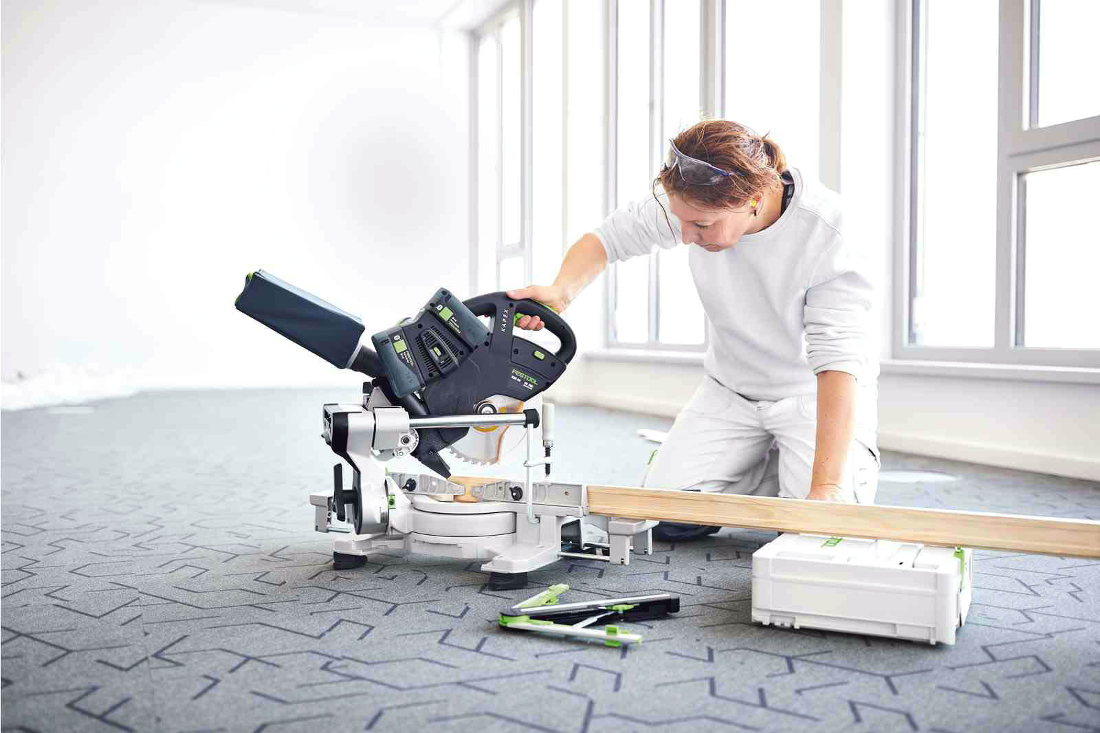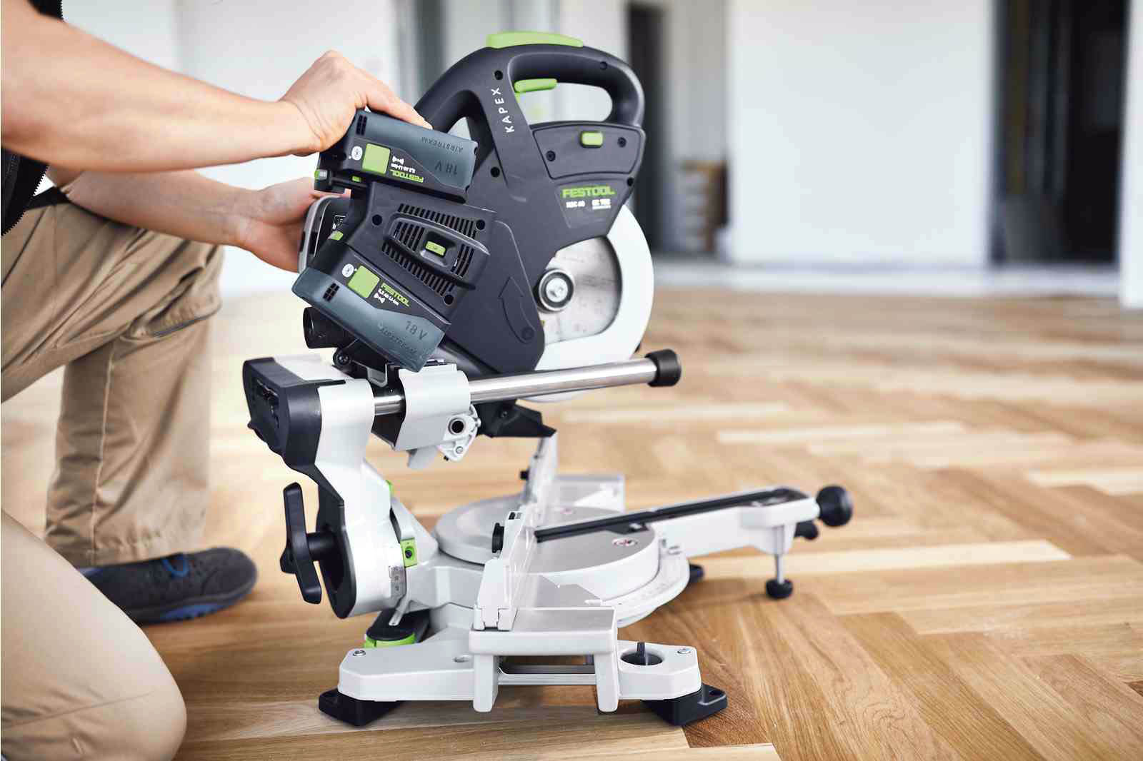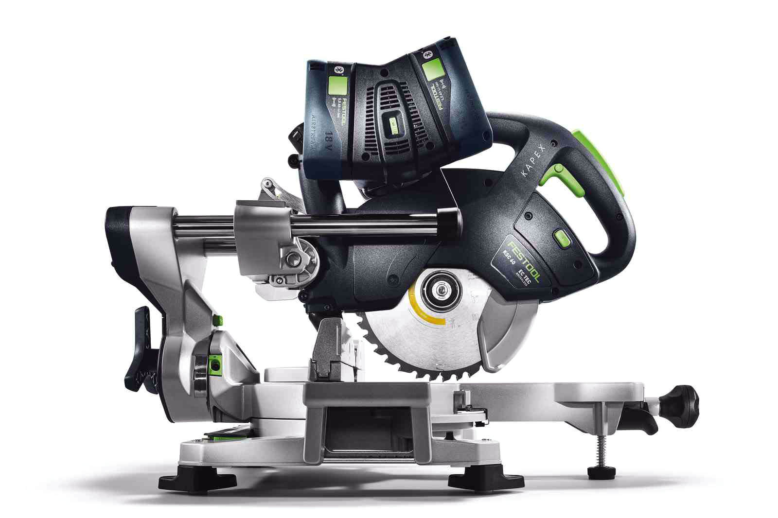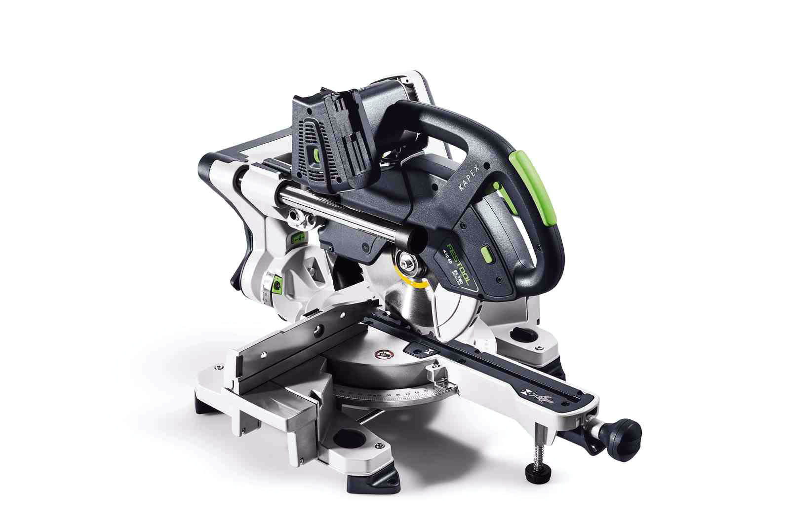 Akumulatorowa ukośnica przesuwna KAPEX KSC 60 charakteryzuje się niewielkim ciężarem i kompaktową konstrukcją, co w połączeniu z komfortowymi uchwytami pozwala na wygodną pracę w każdych warunkach. Wyposażona została w bezszczotkowy silnik EC-TEC, który w połączeniu z systemem podwójnych akumulatorów zapewnia maksymalną wytrzymałość we wszystkich typowych zastosowaniach. Urządzenie posiada dwukolumnową prowadnicę z podwójnym ułożyskowaniem dla precyzyjnego i płynnego prowadzenia tarczy pilarskiej. Ponadto obustronne kąty skosu do 60 stopni i obustronne kąty nachylenia od 46 do 47 stopni umożliwiają wszechstronność zastosowań. Ukośnica Festool współpracuje z tarczami o średnicy 216 mm, a możliwość wyboru spośród wielu tarcz pilarskich pozwala na idealne dopasowanie ukośnicy do zadania. Zaletą ukośnicy KAPEX jest także bezpyłowa praca - pojemnik na pył sprawdza się nawet podczas pracy bez odkurzacza.