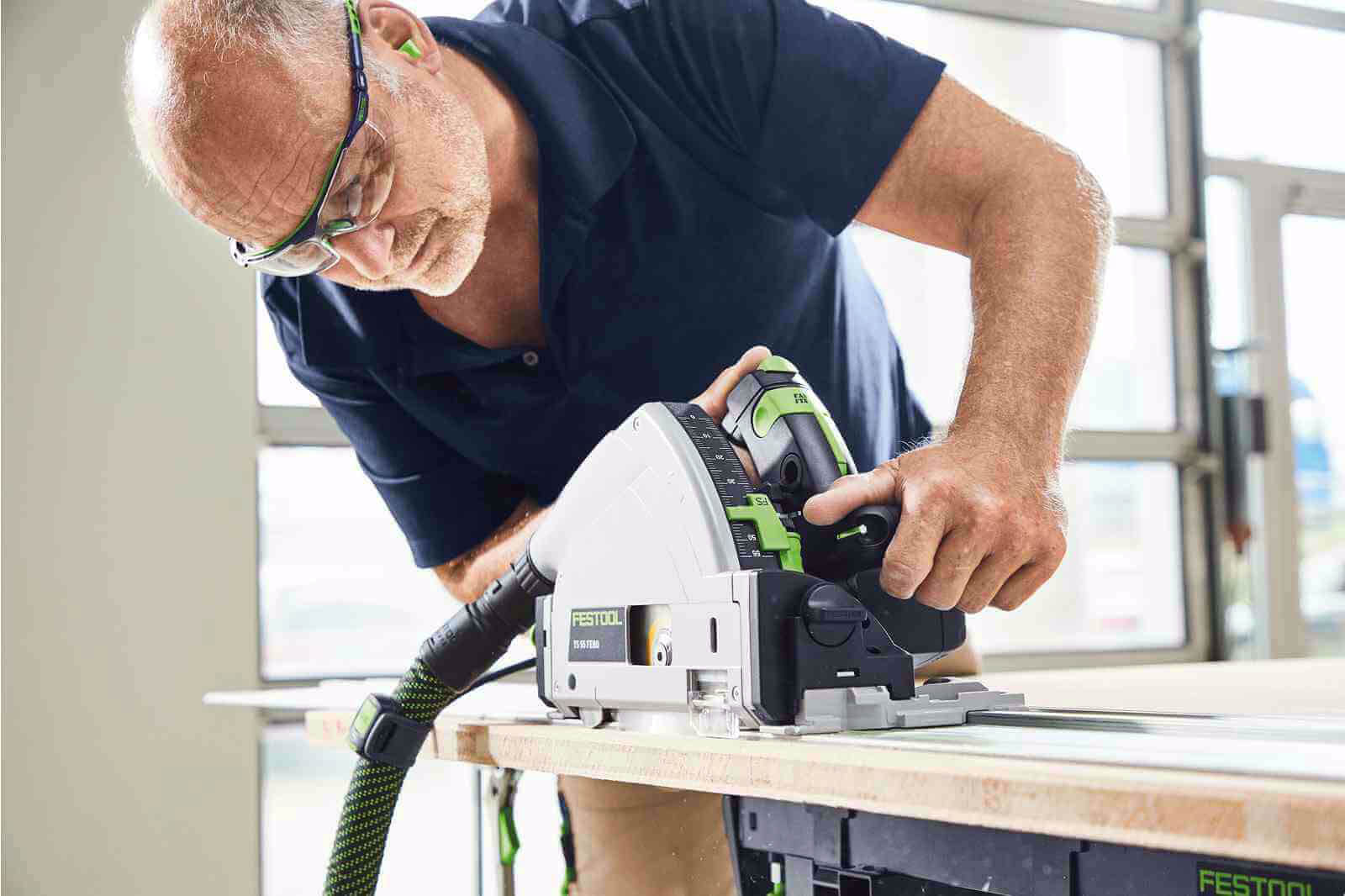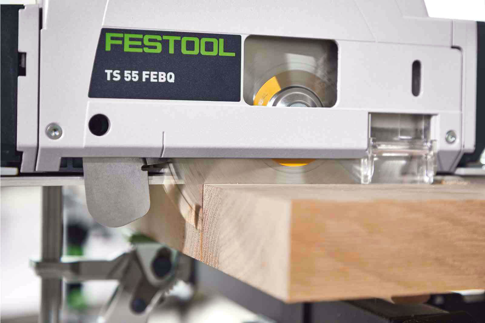 TS 55 FEBQ-Plus posiada sprężyście ułożyskowany klin rozszczepiający, wystający poniżej tarczy, co ułatwia ponowne ustawienie narzędzia w istniejących rzazach i eliminuje ryzyko zakleszczenia. Zagłębiarka posiada także blokadę wrzeciona FastFix, która znacznie ułatwia wymianę tarczy. Zdecydowaną zaletą narzędzia jest możliwość pracy z systemem - szynami prowadzącymi, stołem pilarskim, przykładnicą kątową i wieloma innymi.