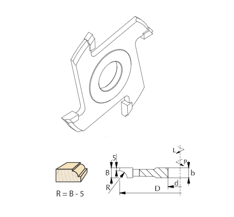 Frez nasadzany profilowy (prawy) typ P-101 Faba o średnicy całkowitej 125 mm i średnicy otworu 30 mm. Frez posiada 4 zęby o grubości 10 mm. Grubość korpusu wynosi 9 mm. Frez stosowany jest do frezowania ćwierćwałka o promieniu R.