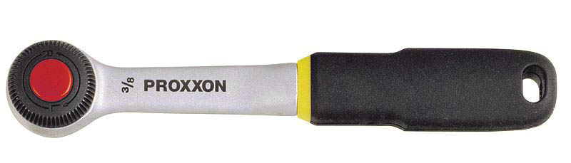 Grzechotka 3/8" Proxxon posiada przełącznik bezpośrednio w głowicy. Precyzyjne zęby grzechotki zazębiając się jednocześnie przenoszą duże momenty. Głowica i rączka grzechotki wykonane zostały z jednorodnego stopu stali chromowo-wanadowej CrV 31 CrV3 z wysoką zawartością związków węgla, co gwarantuje maksymalną wytrzymałość i odporność na uszkodzenia. Uchwyt grzechotki Proxxon wykonany został z TPR odpornego na olej i kwas. Nasadki łatwo zdejmiesz przy pomocy przycisku. Grzechotka Proxxon posiada otwór umożliwiający łatwe zawieszenie.