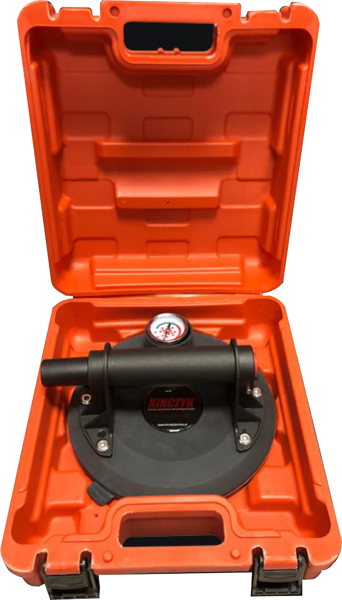 Przyssawka z manometrem Kinczyk o średnicy 200 mm umożliwia udźwig 190 kg. Wygodę użytkowania zapewnia gumowy antypoślizgowy uchwyt, a wbudowany manometr umożliwia stałą kontrolę nad chwytem. Przyssawka Kinczyk umożliwia pracę zarówno z materiałami gładkimi, jak i chropowatymi.