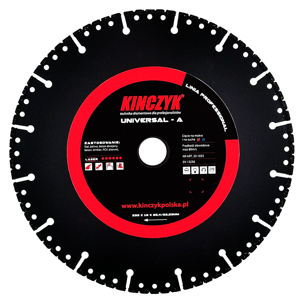 Tarcza UNIVERSAL o średnicy 230 mm, z diamentem syntetycznym, gwarantuje wysoką wydajność i wyjątkowo szybkie cięcie. Sprawdzi się do pracy zarówno na mokro jak i na sucho. Tarcza producenta Kińczyk jest lutowana. Niezależenie od sposobu mocownia wydajność cięcia jest określona poprzez jakość diamentu syntetycznego i spoiwa. Umożliwia pracę ze szczeliniarkami, szlifierkami kątowymi, piłami stołowymi i spalinowymi piłami ręcznymi.