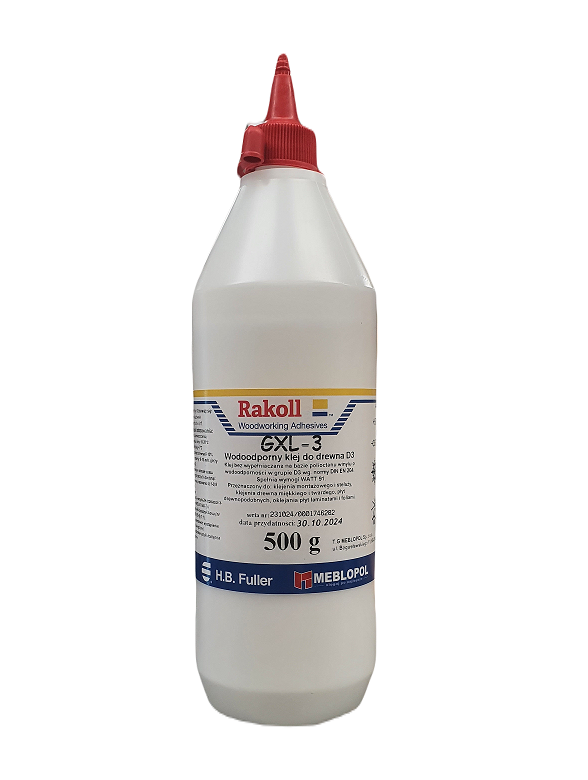 Klej Rakoll GXL3 o pojemności 1 kg przeznaczony do drewna. Rakoll charakteryzuje się świetnymi parametrami wiązania i wytrzymałości mechanicznej i jest wodoodporny. Jest klejem dyspersyjnym, winylowym, a jego czas otwarty i czas wiązania zależy w znacznym stopniu od warunków pracy takich jak temperatura, wilgotność, nasiąkliwość materiału oraz naniesienia i naprężenia w materiale. Dla uzyskania najlepszych wyników zaleca się, aby temperatura pomieszczenia, kleju i materiału wynosiła od 18 do 20°C, wilgotność powietrza 60-70%, a wilgotność drewna 8-10%.