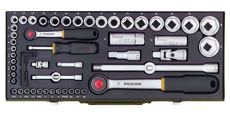 Zestaw narzędziowy PROXXON to komplet narzędzi przeznaczony dla najbardziej wymagających osób. Wszystkie elementy metalowe wykonane zostały ze stali chromowo-wanadowej ze związkami węgla, a końcówki kluczy i bitów ze stali chromowo-krzemowo-manganowo-molibdenowej dla zapewnienia maksymalnej trwałości. Grzechotki z nierozdzielnym uchwytem opatentowane zostały przez firmę Proxxon, stosującą technikę wtrysku z neopropenu odpornego na olej i kwasy oraz posiadają specjalny przycisk na główce ułatwiający wymianę narzędzi.