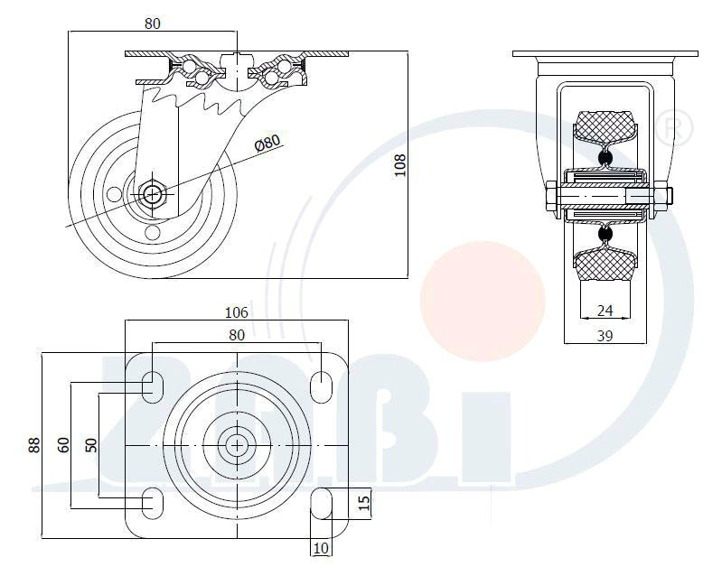 Koło metal-guma d-80 mm skrętne hamulec 60 kg Zabi 6H
