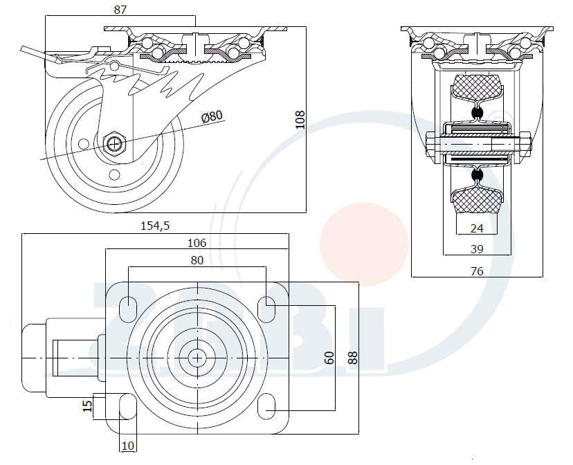 Koło metal-guma d-80 mm skrętne 60 kg ZABI 3L