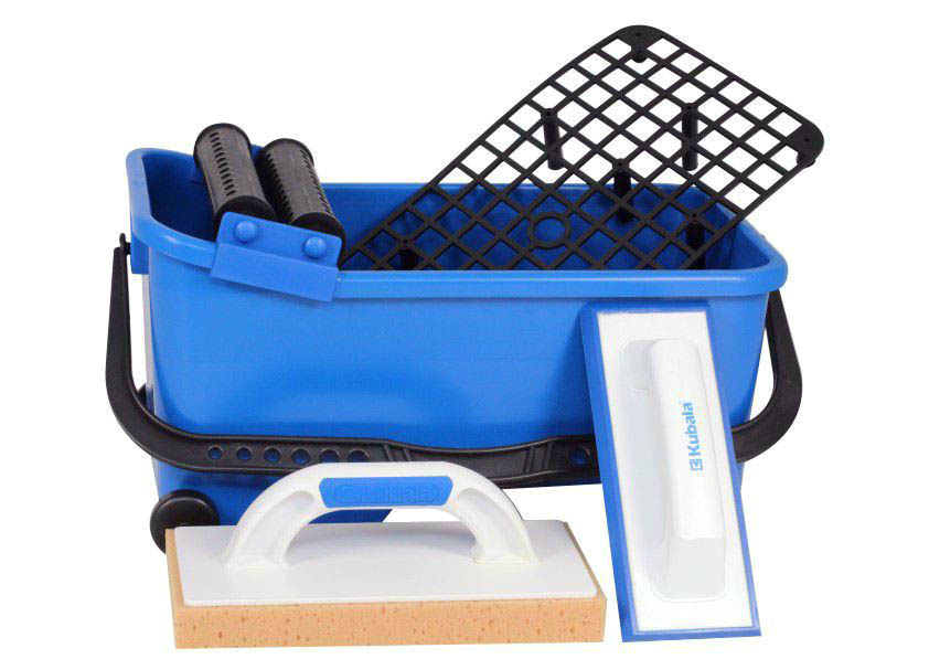 Komplet glazurniczy Kubala zawiera narzędzia niezbędne przy układaniu płytek. W skład kompletu wchodzą: wiadro glazurnicze 20l, rolki do wiadra, kratka i kółka do wiadra, paca z tworzywa z gąbką nacinaną oraz paca do spoinowania.
