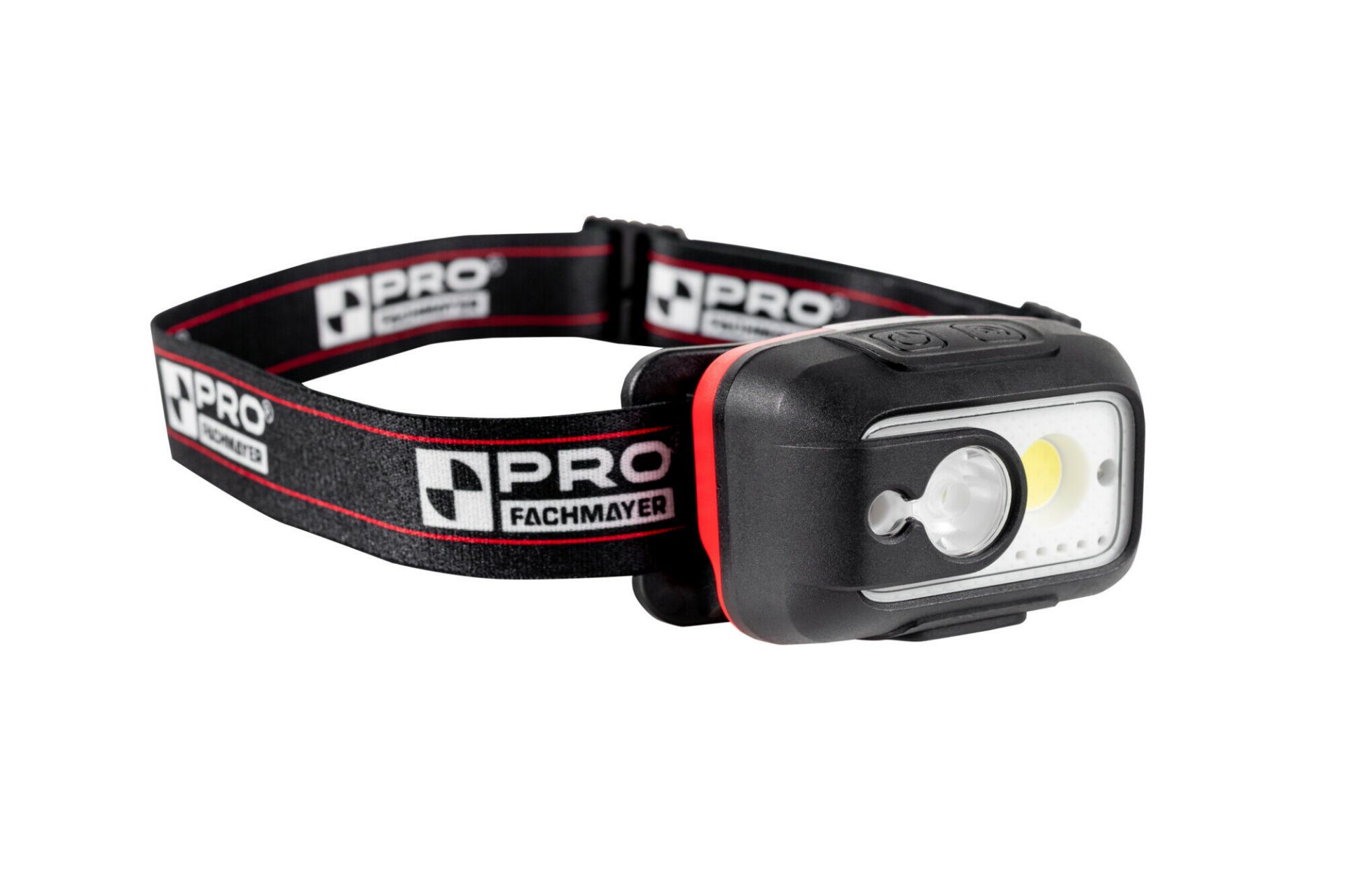 Latarka czołowa PRO Fachmayer wyposażona została w diody SMD LED (5W), pasek COB LED (3W) oraz sensor ruchu. Umożliwia oświetlenie o mocy 450 lumenów i trzy tryby pracy. Korpus lampy wykonany został z termopolimeru ABS pokrytego gumą termoplastyczną TPR. Latarka zasilana jest akumulatorem litowo-jonowym 3.7 V, 1800 mAh, którego czas ładowania wynosi 3,5 h. Wskaźnik zużycia akumulatora - niebieskie diody pozwala na pełną kontrolę nad pracą.