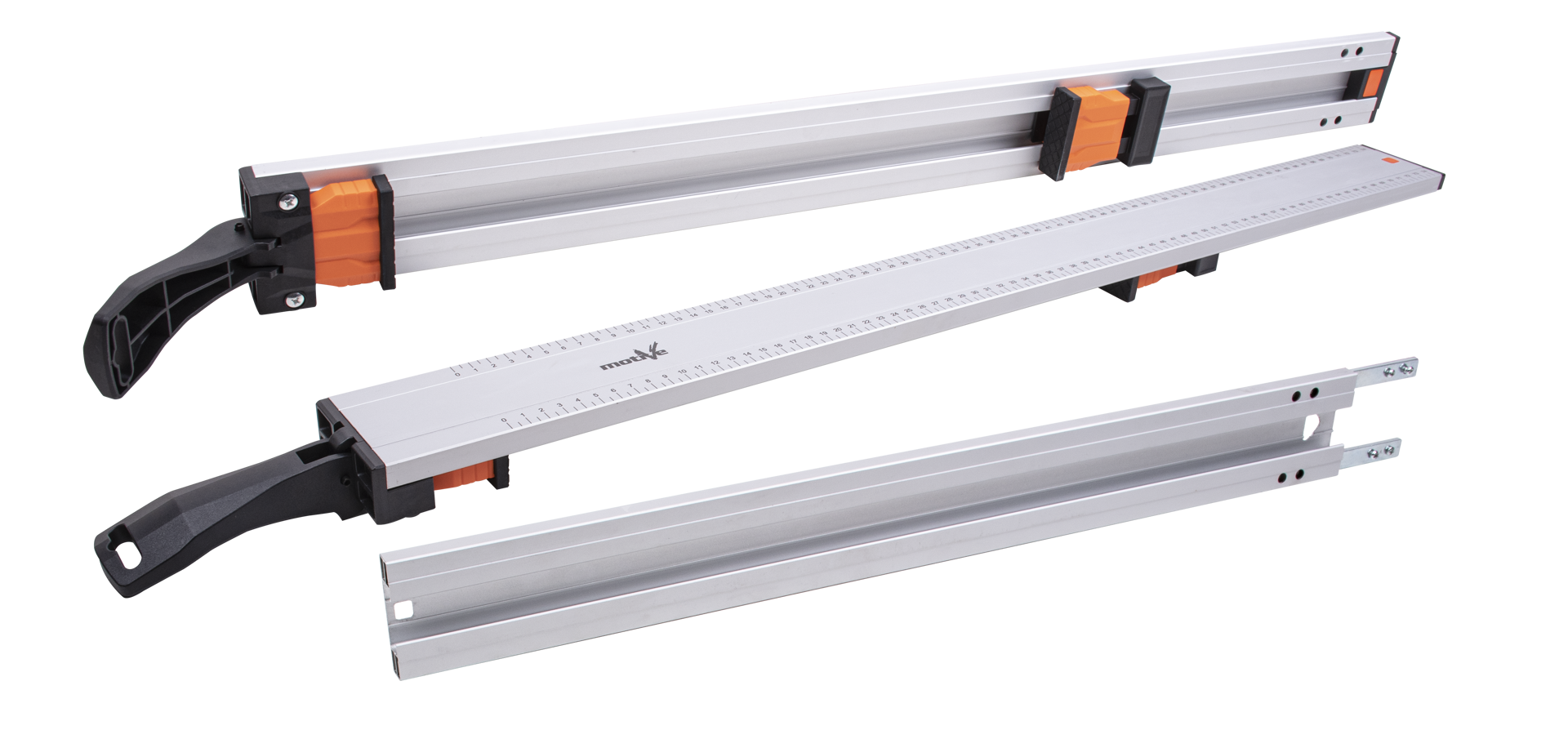 Listwa zaciskowa prowadząca szeroka 900 Motive umożliwiająca dołożenie listwy przedłużającej 625 mm lub 1250 mm. Listwa wykonana została z szerokiego sztywnego profilu (8 cm) z anodowanego aluminium. Posiada nadrukowaną przedziałkę w centymetrach, zacisk ułatwiający pracę jedną ręką oraz przesuwany zaczep samoblokujący. Listwa sprawdzi się w użytkowaniu z każdą piłą tarczową, frezarką, wyrzynarką czy zagłębiarką, a nawet z piłą ręczną czy nożykiem. Listwa pozwala na zaciśnięcie przedmiotu o długości 935 mm i znacznie ułatwia cięcie płyt meblowych, OSB, sklejek czy drewnianych blatów.