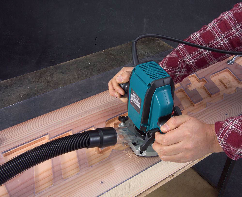 RP0900 usprawni pracę, dzięki łatwej w odczycie skali głębokości frezowania oraz możliwości ustawienia w odwrotnej pozycji podczas wymiany akcesoriów. Frezarka pozwala na podłączenie urządzenia odsysającego, po zastosowania odpowiednich końcówek.