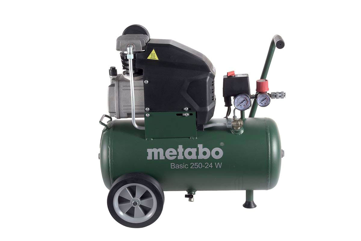 Sprężarka tłokowa BASIC Metabo ze zbiornikiem 24l sprawdzi się przy prostych zastosowaniach warsztatowych. Wygodna i łatwa w transporcie, dzięki gumowanemu uchwytowi i stabilnym gumowym kołom. Urządzenie zostało wyposażone w zabezpieczenie przed przeciążeniem, co pozwala chronić silnik przed przegrzaniem zapewniając długą żywotność. Wydajna sprężarka umożliwia uruchomienie na zimno, z pomocą wyłącznika ciśnieniowego z zaworem odciążającym. Zasilana jest jednofazowym prądem przemiennym i posiada kabel o długości 1,5m. Reduktor z manometrem pozwala na regulację ciśnienia wyjściowego, a dodatkowy manometr pozwoli na kontrolę ciśnienia w zbiorniku.