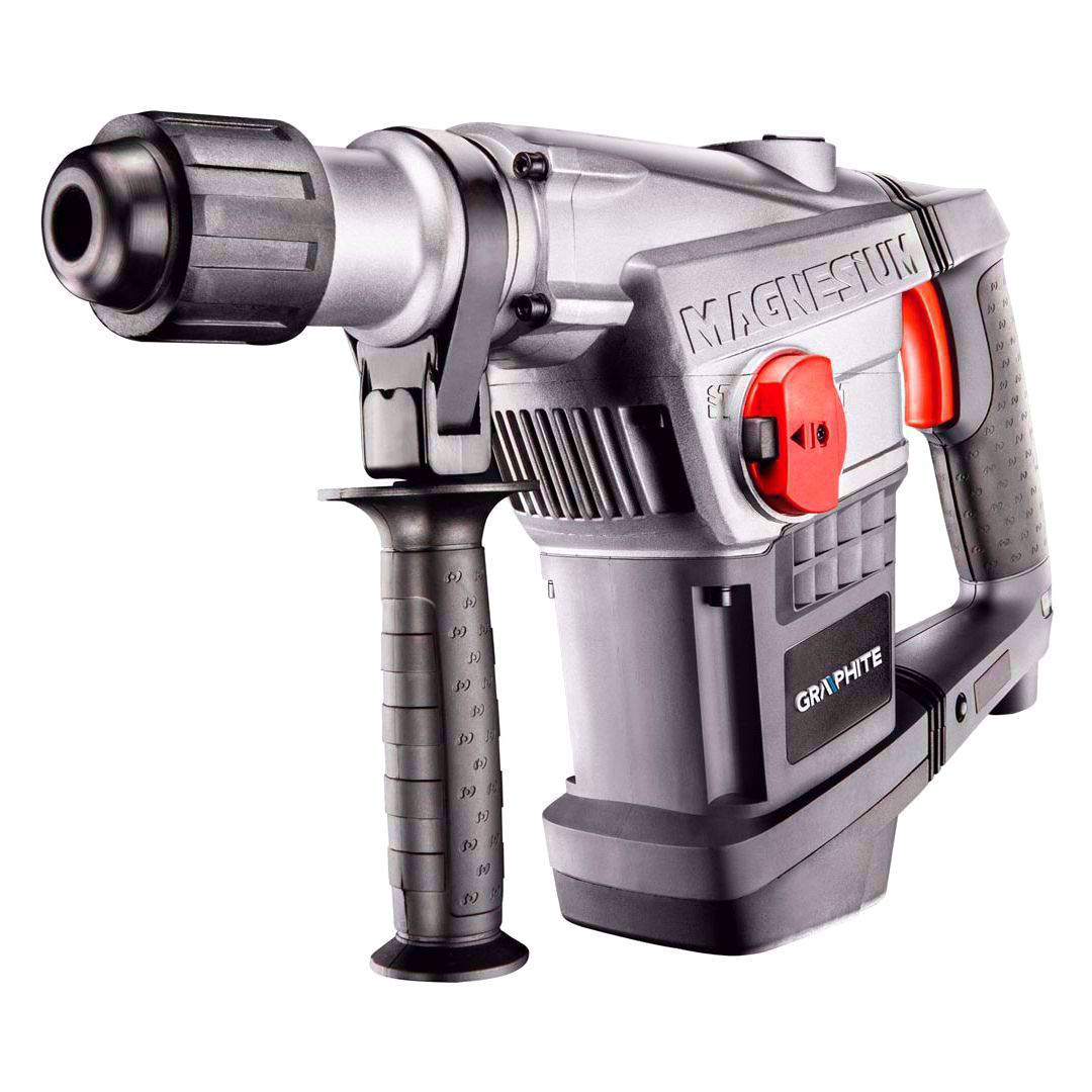 Specjalistyczny 2-funkcyjny młot udarowy SDS MAX GRAPHITE o mocy 1250W, niezastąpiony podczas prac instalacyjnych i rozbiórkowych. Posiada możliwość wiercenia z udarem pneumatycznym oraz funkcję podkuwania, przydatną podczas redukcji powierzchni otynkowanych. Maksymalna energia udaru 10 J daje urządzeniu zdecydowaną przewagę podczas starcia z materiałami, takimi jak beton, cegła, czy kamień. Maksymalna liczba udarów przy nominalnej prędkości obrotowej wynosi 2800 min⁻¹, maksymalna ilość obrotów podczas wiercenia to 450 min⁻¹. Mechanizm młota został zabezpieczony sprzęgłem przeciążeniowym, chroniącym użytkownika przed przypadkowym zablokowaniem wiertła. Rękojeść główna z dwupunktowym systemem antywibracyjnym pokryta jest materiałem antypoślizgowym. Obudowa przekładni urządzenia została wzmocniona stopem magnezu. Ponadto urządzenie wyposażone jest w wygodny czteropalcowy włącznik, kontrolkę informującą o podłączeniu do sieci oraz łatwo dostępny otwór do smarowania mechanizmu udarowego. W zestawie z młotem znajdują się dodatkowe wiertło i dłuto, rękojeść pomocnicza z możliwością regulacji kąta, osłona przeciwpyłowa, zasobnik ze smarem i praktyczna walizka. Zgodność z europejskimi standardami zapewnia certyfikat CE.