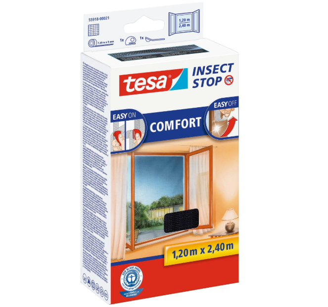 Moskitiera do okien tesa® Comfort w kolorze czarnym - skuteczne zabezpieczenie przed owadami.