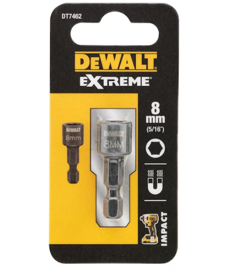 Udarowa nasadka magnetyczna DeWalt przeznaczona do śrub i nakrętek w rozmiarze 8 mm z trzpieniem sześciąkąnym 1/4". Nasadka o wysokości całkowitej 35 mm i wysokości części nasadki 14 mm umożliwia mocowanie elementów w ograniczonych przestrzeniach. Specjalny profil nasadki DeWalt gwarantuje sprawne dokręcanie i odkręcanie śrub bez uszkodzenia ich narożników. Końcówka nasadowa przeznaczona jest do wszystkich wiertarko-wkrętarek i zakrętarek udarowych.