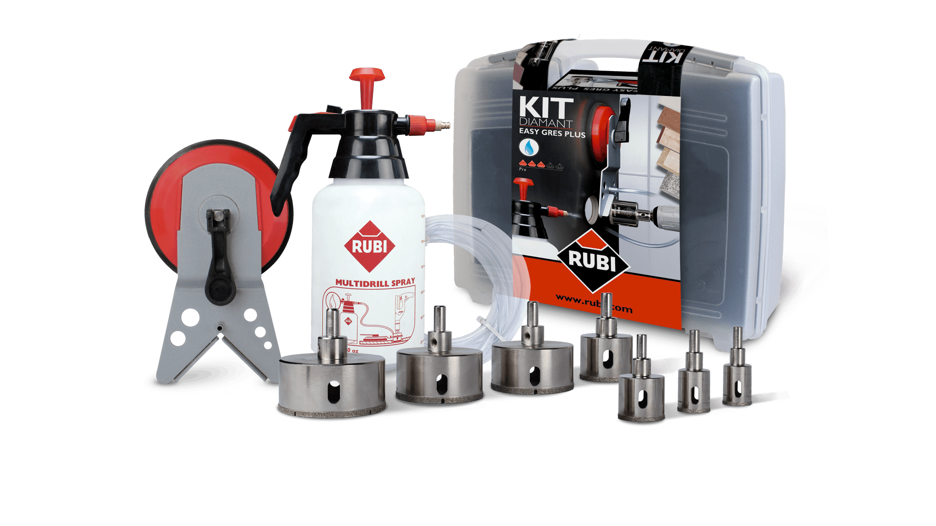 W ofercie znajdują się różne zestawy wierteł, odpowiednie do najpopularniejszych prac wykończeniowych.Wiertła o średnicy 6-12 mm są dostępne w zestawach składających się z: jednego lub więcej wierteł (w zależności od modelu), prowadnicy EASYGRES, tulejek centrujących oraz dwustronnych przylepców.Dzięki funkcjonalnej konstrukcji zbiorniczka wodnego z zaworkiem regulującym wypływ wody, prowadnica EASYGRES umożliwia wykonywanie otworów zarówno w pionie, jak i w poziomie. Przylepce umożliwiają łatwe mocowanie prowadnicy na dowolnej powierzchni.Poza tymi praktycznymi zestawami RUBI oferuje również zestaw EASYGRES PLUS, składający się z: 7 wierteł EASYGRES (20, 28, 35, 43, 50, 68 i 75 mm), prowadnicy MULTIDRILL, hydronetki oraz praktycznej walizki.W ofercie znajduje się również zestaw z najpopularniejszą koronką o średnicy 35 mmm oraz prowadnicą MULTIDRILL i hydronetką.Średnia trwałość wierteł EASYGRES różni się zależnie od średnicy. Dla wierteł 6-12 mm jest to 10 otworów, a dla koronek 20-120 mm 25 otworów. Średnia trwałość wierteł ZAWSZE zależy od typu materiału i jego grubości, oraz odpowiedniego chłodzenia i użytkowania.Wiertła EASYGRES mogą wykonywać otwory do 25 mm głębokości.Boczny otwór pozwala na lepsze chłodzenie i usuwanie pozostałości po wywierceniu każdego otworu. Należy pamiętać o każdorazowym oczyszczeniu i sprawdzeniu wiertła przez rozpoczęciem wiercenia.Zalecana szybkość robocza wiertła wynosi od 400 do 1000 obr/min. w zależności od rodzaju wierconego materiału.Dla zapewnienia dobrego wykończenia otworu oraz trwałości wiertła nie należy przekraczać podanych wielkości obrotowych, ani nie wywierać nadmiernego nacisku na wiertło podczas pracy.