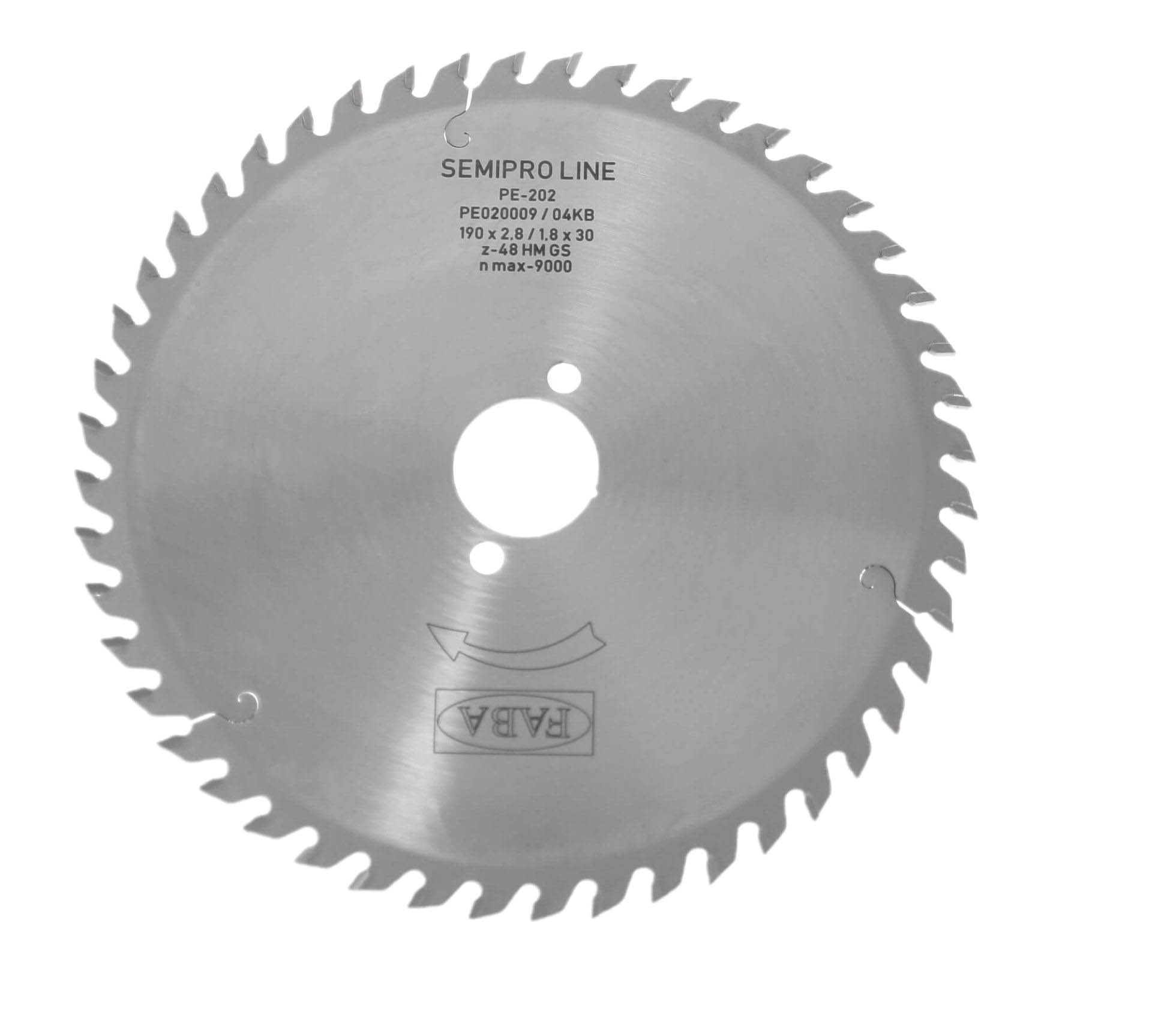 Piła PE-202 Faba o średnicy 190 mm z otworem 30 mm, z uzębieniem naprzemianskośnym GS. Tarcza o grubości 1,8 mm posiada 48 zębów o grubości 2,8 mm i kącie natarcia 15 stopni. Piła przeznaczona jest do cięć pojedynczych i poprzecznych za pomocą pilarek tarczowych ręcznych i zagłębiarek.