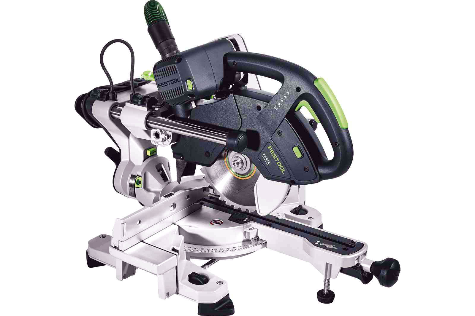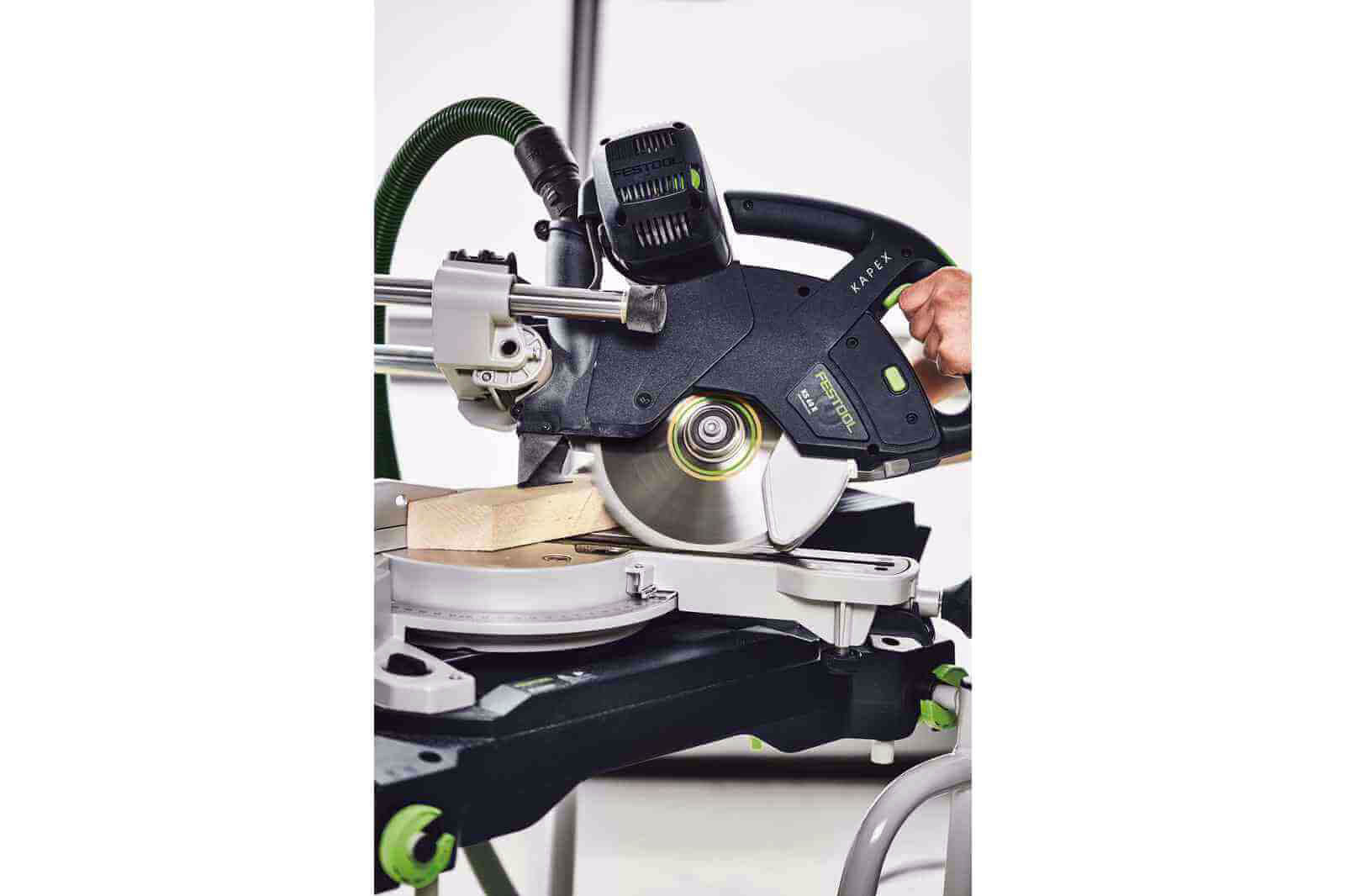KAPEX KS 60 umożliwia obustronny kąt skosu do 60 stopni, ustawiany za pomocą dźwigni na stole, a zaznaczone domyślnie kąty pozwalają na szybki wybór. Przy pomocy prostego w obsłudze zacisku i precyzyjnej skali kątowej ustawisz obustronny kąt nachylenia 47 lub 46 stopni. Zmienne ustawienie liczby obrotów pozwala na dopasowanie do materiału. Szybką i bezpieczną wymianę tarczy umożliwia blokada wrzeciona i klucz imbusowy umieszczony w specjalnym schowku, a system tarcz producenta pozwala dopasować tarczę idealnie do obrabianego elementu. Ukośnica zapewnia optymalny widok, dzięki lampie LED, która emituje promień światła wyznaczając linię cięcia. Skuteczne odsysanie zapewnia odkurzacz Festool dla czystości przy pracy i ochrony zdrowia. Dodatkowe elementy mocujące pozwalają na podniesienie stołu i przekształcenie go w stół do pracy, ze stabilnym podparciem długich elementów.