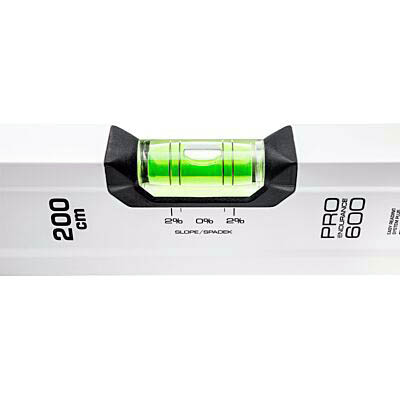 Poziomnica PRO600 wyposażona została w dodatkowe pierścienie umożliwiające wyznaczenie 2% spadku oraz nowoczesną libellę zapewniającą łatwy odczyt, zamocowaną tak, aby wycięcie profilu było jak najmniejsze. Ponadto libella z systemem ERS+ usprawnia odczytanie pomiaru niezależnie od kąta patrzenia, dzięki powiększeniu komory i soczewki.