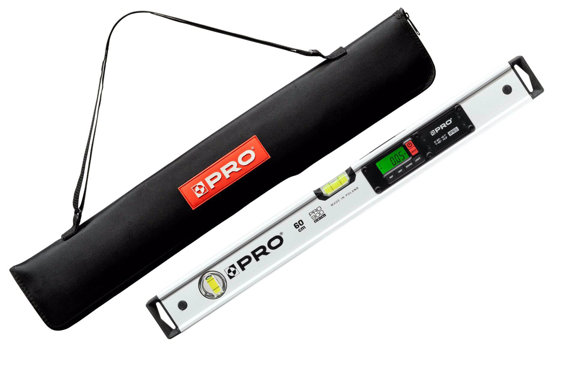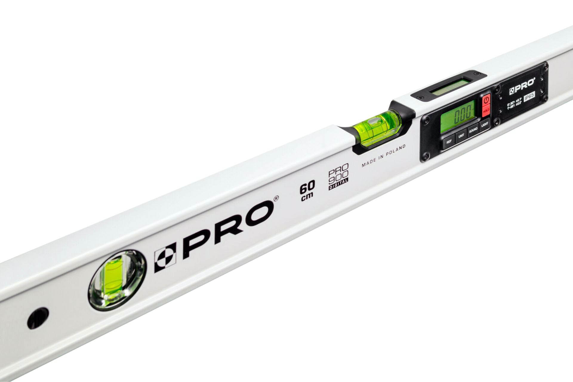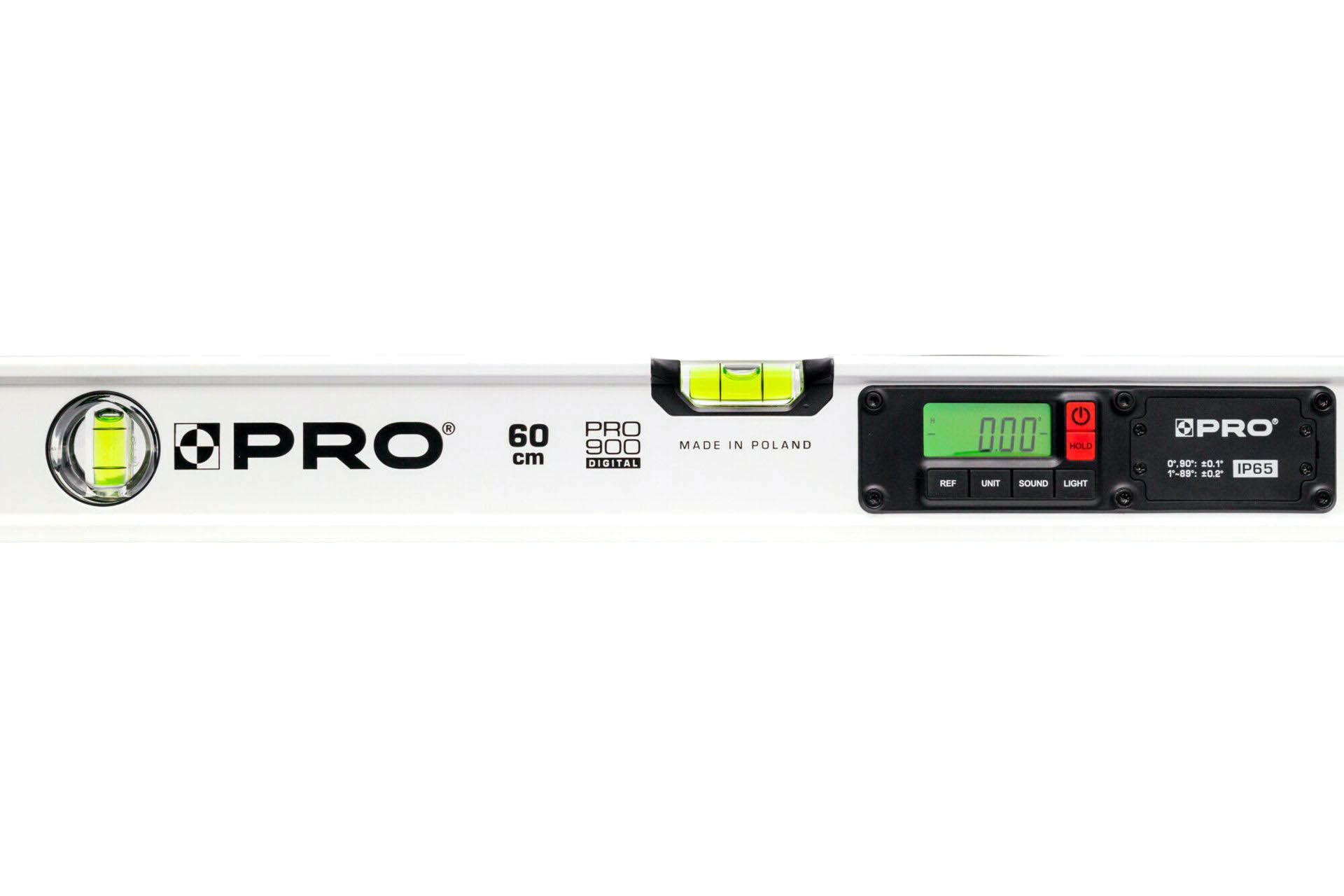 Poziomnica elektroniczna PRO900 o długości 60 cm to maksymalnie wytrzymałe narzędzie ze sztywnym trzykomorowym profilem. Poziomnica umożliwia wygodny pomiar, dzięki dwóm podświetlanym wyświetlaczom oraz sygnałowi dźwiękowemu informującemu o osiągnięciu kąta 0°, 30°, 45°, 60° lub 90°. Ponadto posiada funkcję HOLD, która zachowuje wynik pomiaru uzyskany w trudnych warunkach do późniejszego odczytu. Poziomnica PRO gwarantuje dokładność pomiaru - ±0,1° w przypadku pomiarów przeprowadzanych pod kątem 0° i 90° oraz ±0,2° w zakresie 0°- 89° i pozwala na zapamiętanie, aż 19 wyników. Narzędzie wyposażono w szereg funkcji, które pozwalają na wybór jednostki pomiaru, włączenie podświetlenia wyświetlacza, sygnał dźwiękowy, ustalenie płaszczyzny dla pomiaru względnego, a nawet samodzielne skalibrowanie urządzenia.