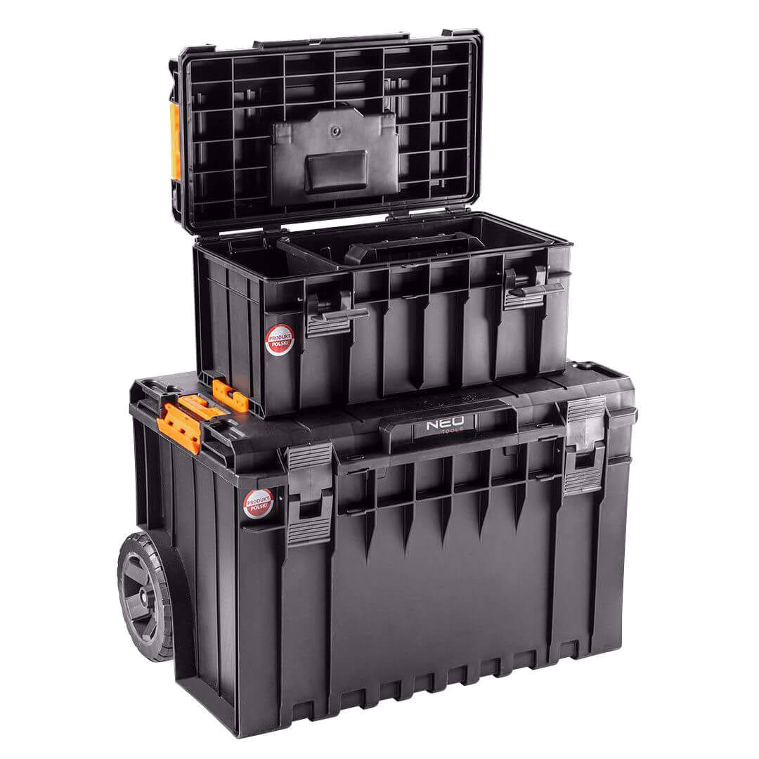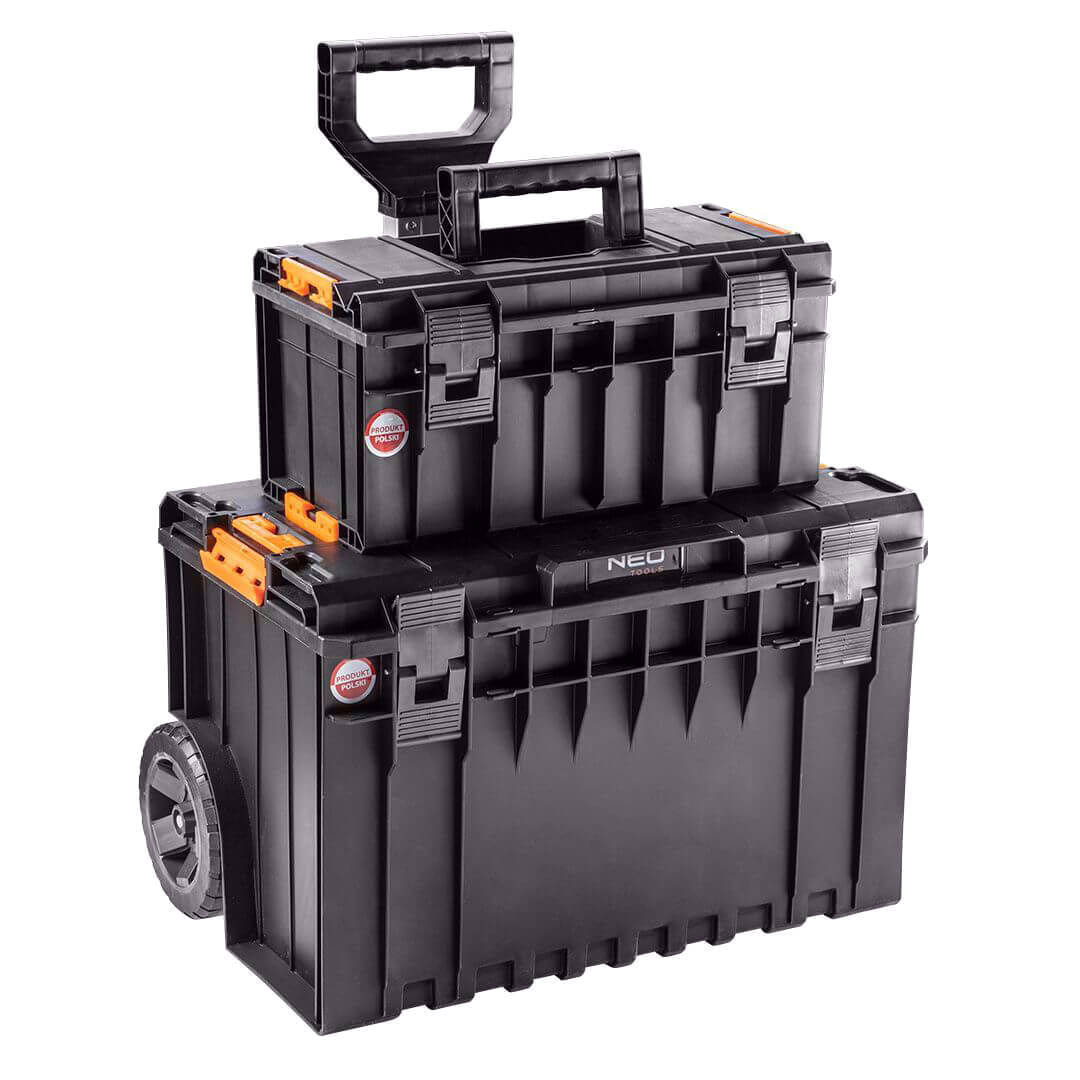 Skrzynia dwumodułowa NEO przeznaczona jest do transportu i magazynowania narzędzi budowlanych. Stabilna konstrukcja, wytrzymałe koła i teleskopowy uchwyt znacznie ułatwiają przewożenie ciężkiego sprzętu. Mniejsza skrzynia pozwala przechowywać małe narzędzia i akcesoria, natomiast w większej zmieszczą się elektronarzędzia i inne narzędzia ręczne. Praktyczne rozwiązanie dla osób lubiący dobrą organizację pracy.