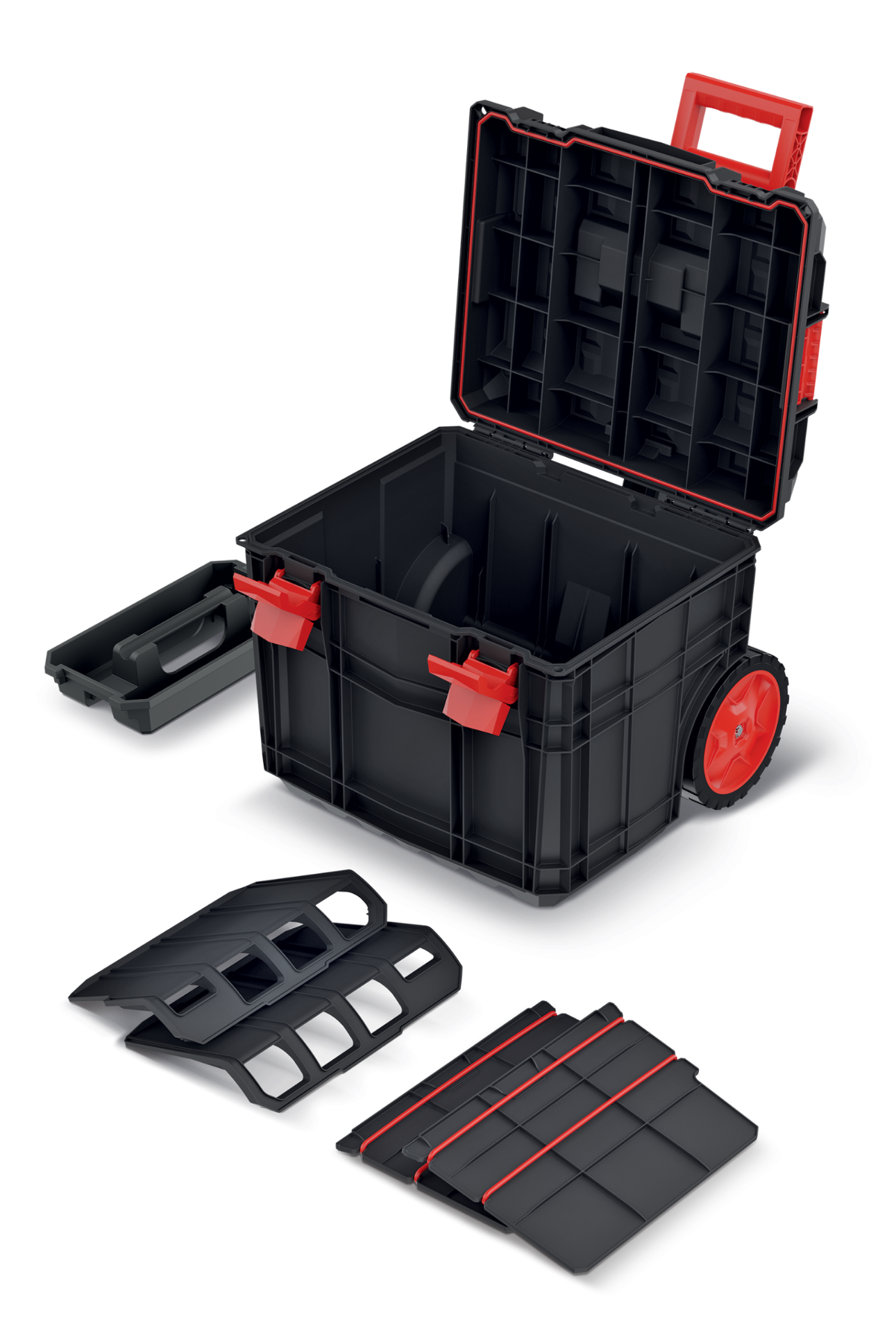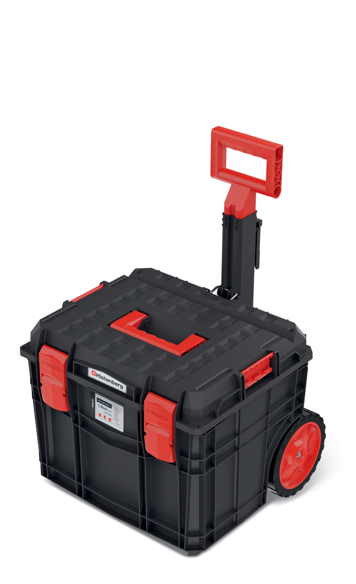 Skrzynia narzędziowa na kołach C BLOCK PRO Kistenberg wyposażona w 2 uchwyty na narzędzia ręczne, 2 wyjmowane przegrody do aranżacji przestrzeni wewnętrznej oraz 1 nosidło na narzędzia. Korpus walizki wykonany został z mieszanki polimerów o podwyższonej wytrzymałości, a w pokrywę została wbudowana miara w centymetrach i calach. Skrzynia posiada wytrzymałe zapięcia ABS, metalowe zawiasy oraz litą uszczelkę zapewniającą odporność na pył i zalanie. Wygodny transport skrzyni umożliwia wytrzymały uchwyt teleskopowy oraz bieżnikowane koła z elastomeru. Skrzynia zapewnia odporność na nacisk do 100 kg i jest kompatybilna z produktami serii C BLOCK, C BLOCK BRIDGE, X BLOCK PRO, X BLOCK ALU LOG, S BLOCK 45.