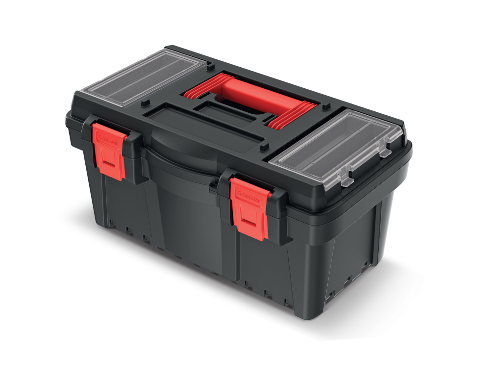 Skrzynka narzędziowa DARK 50 KISTENBERG o długości 480 mm. Skrzynka posiada 2 organizery w pokrywie z jedną stałą przegrodą oraz egonomiczny uchwyt i zapięcia ABS. Korpus wykonany został z wytrzymałej mieszanki polimerów. Skrzynka umożliwia przenoszenie narzędzi o wadze nawet 12 kg, a organizery w pokrywie ułatwiają przechowywanie małych elementów np. wkrętaków czy bitów.