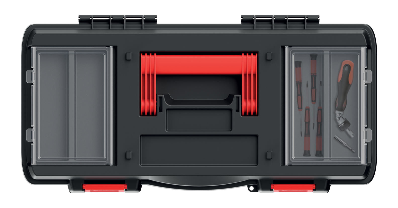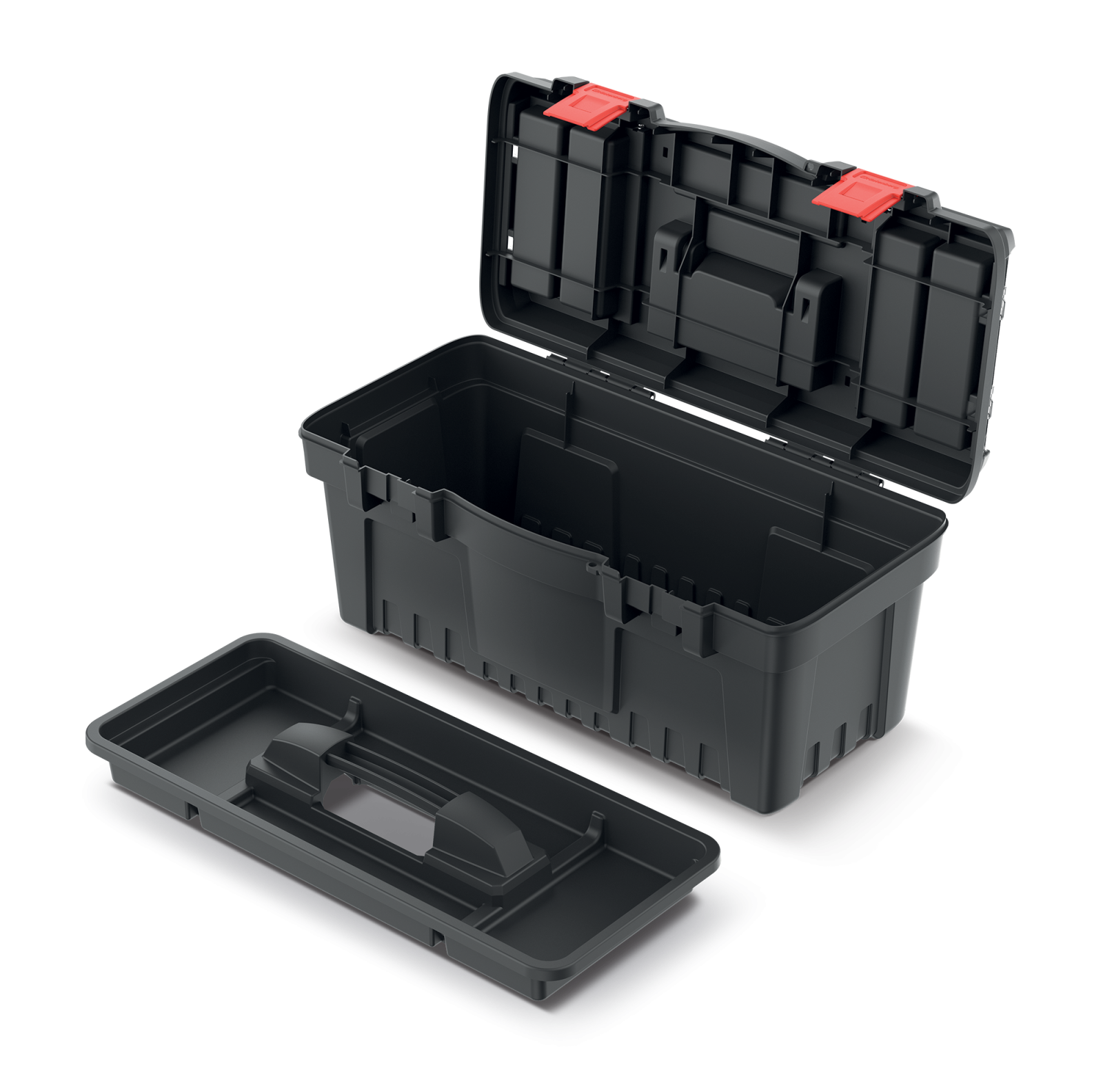 Skrzynka narzędziowa DARK 55 KISTENBERG o długości 548 mm. Skrzynka posiada 2 organizery w pokrywie z jedną stałą przegrodą oraz egonomiczny uchwyt i zapięcia ABS. Korpus wykonany został z wytrzymałej mieszanki polimerów. Skrzynka umożliwia przenoszenie narzędzi o wadze nawet 19 kg, a organizery w pokrywie ułatwiają przechowywanie małych elementów np. wkrętaków czy bitów.