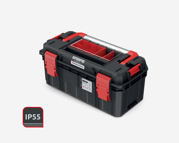 Skrzynia narzędziowa S BLOCK ALU LOG 55 Kistenberg o wysokości 264 mm i szerokości 550 mm. Wyposażona w długi aluminiowy uchwyt, 1 przegrodę do aranżacji przestrzeni wewnętrznej oraz organizer w pokrywi z 4 przegrodami i 4 kubeczkami. Korpus walizki wykonany został z mieszanki polimerów o podwyższonej wytrzymałości. Skrzynia posiada wytrzymałe zapięcia ABS, metalowe zawiasy oraz litą uszczelkę zapewniającą odporność na pył i zalanie. Skrzynia umożliwia funkcję podestu roboczego o wytrzymałości na obciążenie do 100 kg i jest kompatybilna z S BLOCK PRO 55, S BLOCK ALU LOG 55, X BLOCK PRO, X BLOCK ALU LOG, X BLOCK Wagon.