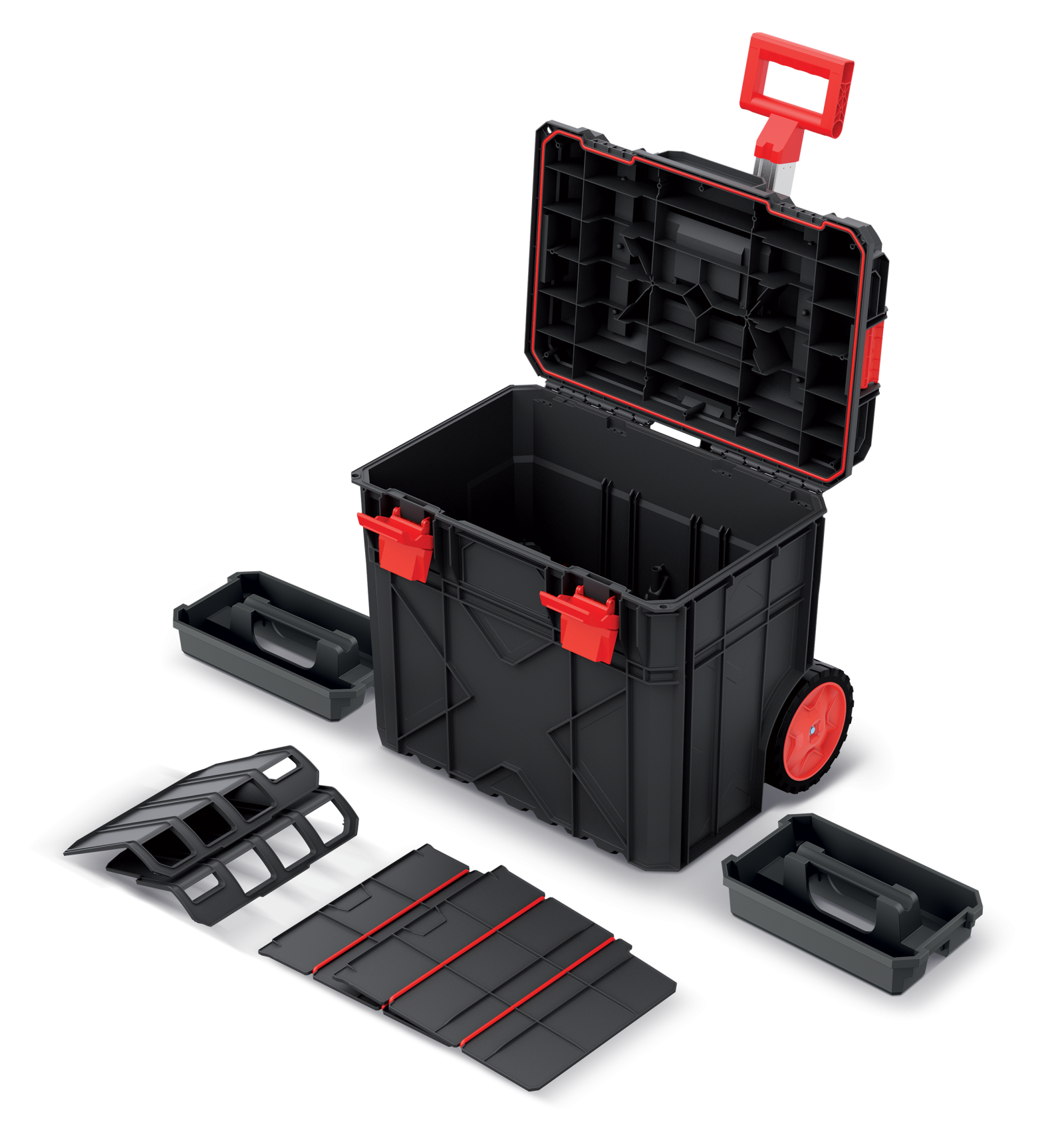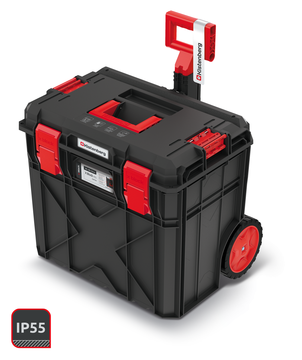 Walizka narzędziowa X BLOCK PRO 50 na kołach Kistenberg o wysokości 510 mm z wytrzymałym teleskopowym uchwytem. Korpus walizki wykonany został z mieszanki polimerów o podwyższonej wytrzymałości. Walizka posiada 2 nosidła i 2 uchwyty na narzędzia ręczne oraz 2 wyjmowane przegrody do organizacji przestrzeni wewnątrz. Dodatkową zaletą skrzyni jest miara w centymetrach i calach wbudowana w pokrywę oraz możliwość wykorzystania skrzyni jako podestu roboczego - z wytrzymałością na obciążenie do 120 kg. Walizka posiada także zapięcia z ABS i metalowe zawiasy oraz litą uszczelką, która zapewnia odporność na pył i zalanie. Mobilność walizki i wygodne prowadzenie zapewniają solidne bieżnikowane koła z elastomeru. Skrzynia narzędziowa jest kompatybilna z X BLOCK, X BLOCK BRIDGE, C BLOCK, C BLOCK BRIDGE, S BLOCK PRO 45, S BLOCK PRO 55, S BLOCK ALU LOG 45, S BLOCK ALU LOG 55.