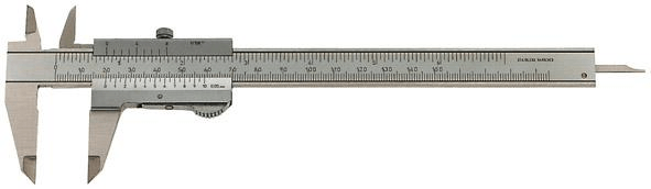 Ze stali nierdzewnej. Z osadzoną niżej podziałką główną i tabelą gwintów na odwrocie, z prostokątnym głębokościomierzem. Dostawa w futerale ze sztucznej skóry.