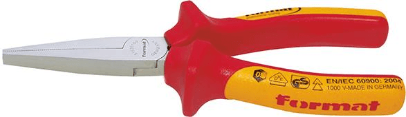 DIN ISO 5745. Hartowana w oleju i odpuszana. Główka chromowana, długie, płaskie szczęki, powierzchnie chwytne ząbkowane, rękojeści z wielokomponentowymi nasadkami z tworzyw sztucznych, izolowane do 1000 V, według IEC 60900, VDE 0682/część 201.