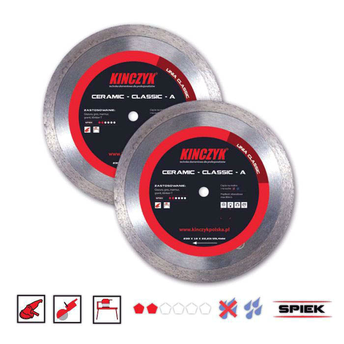 Tarcza CERAMIC CLASSIC A o średnicy 230mm z diamentem syntetycznym gwarantuje wysoką wydajność i wyjątkowo szybkie cięcie. Sprawdzi się do pracy zarówno na mokro jak i na sucho. Tarcza producenta Kińczyk jest spiekana bezpośrednio na dysk, co pozwala na całkowite zużycie segmentu. Niezależenie od sposobu mocownia wydajność cięcia jest określona poprzez jakość diamentu syntetycznego i spoiwa. Umożliwia pracę ze szlifierkami kątowymi, piłami stołowymi i spalinowymi piłami ręcznymi.