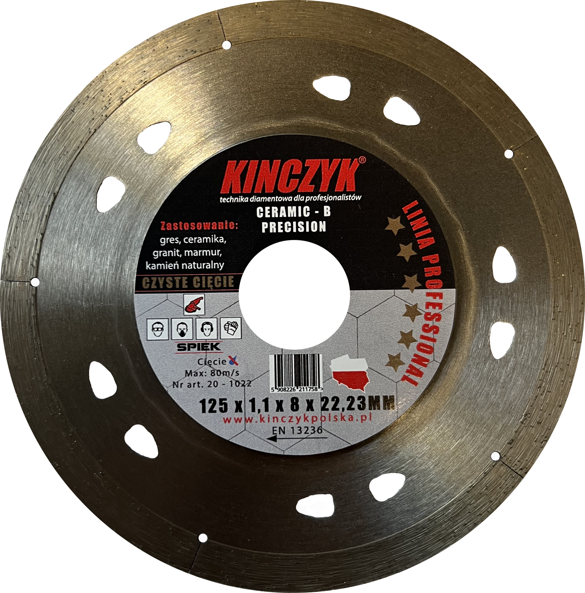 Tarcza diamentowa Kińczyk Ceramic-B Precision o średnicy 125 mm z otworem 22,23 mm. Tarcza posiada segment ciągły i umożliwia szybkie cięcie na sucho. System mocowania na spiek zapewnia długą żywotność tarczy. Przeznaczona do cięcia klinkieru, marmuru, granitu, ceramiki, gresu i kamienia naturalnego za pomocą szlifierek kątowych i pilarek stołowych.