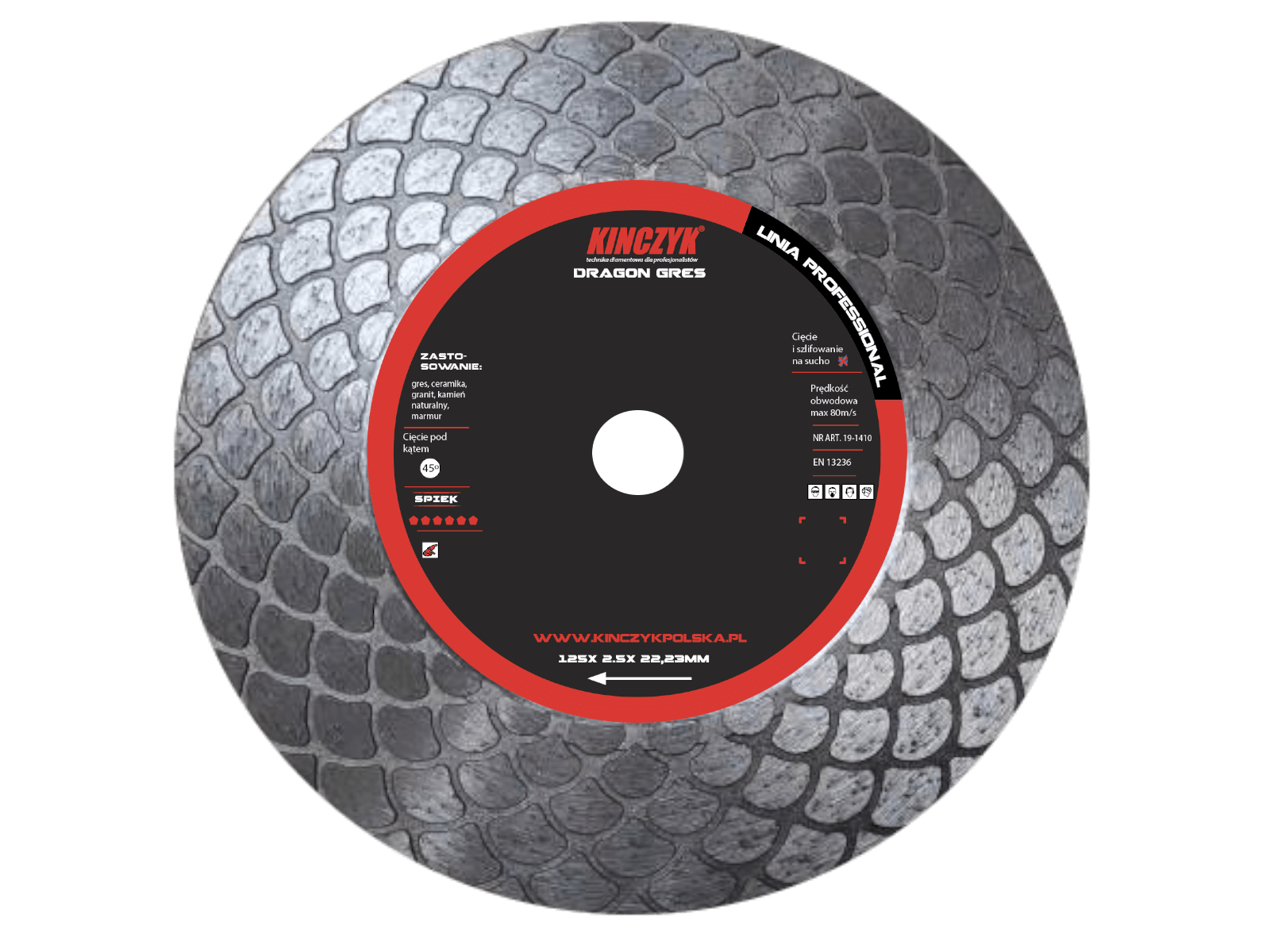 Tarcza DRAGON-GRES o średnicy 125mm, gwarantuje wysoką wydajność i wyjątkowo szybkie cięcie. Sprawdzi się do pracy zarówno na mokro jak i na sucho. Tarcza producenta Kińczyk jest spiekana bezpośrednio na dysk, co pozwala na całkowite zużycie segmentu. Niezależenie od sposobu mocownia wydajność cięcia jest określona poprzez jakość diamentu syntetycznego i spoiwa. Umożliwia pracę ze szlifierkami kątowymi, piłami stołowymi i spalinowymi piłami ręcznymi.