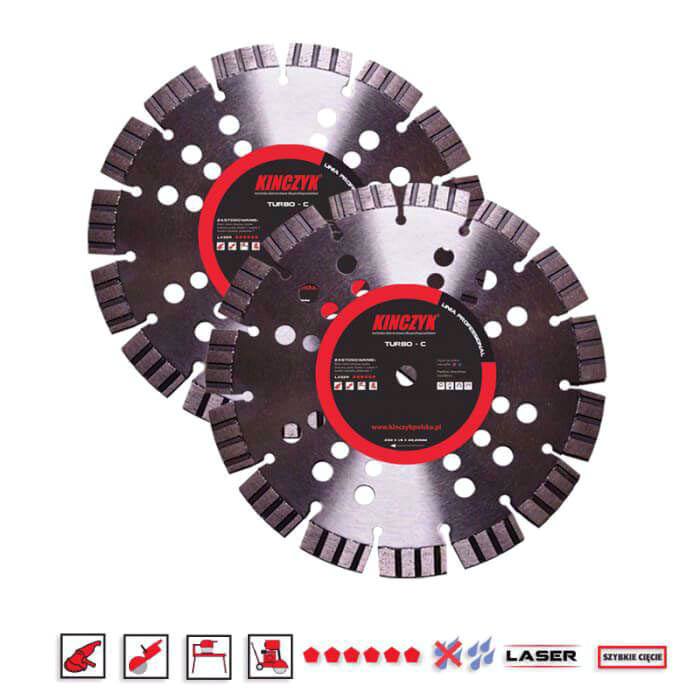 Tarcza TURBO C o średnicy 230mm, z diamentem syntetycznym, gwarantuje wysoką wydajność i wyjątkowo szybkie cięcie. Sprawdzi się do pracy zarówno na mokro jak i na sucho. Tarcza producenta Kińczyk jest spawana laserowo do dysku, umożliwiając cięcie na sucho przy większych średnicach. Niezależnie od sposobu mocownia wydajność cięcia jest określona poprzez jakość diamentu syntetycznego i spoiwa. Umożliwia pracę ze szlifierkami kątowymi, piłami stołowymi, spalinowymi piłami ręcznymi i szczeliniarkami.