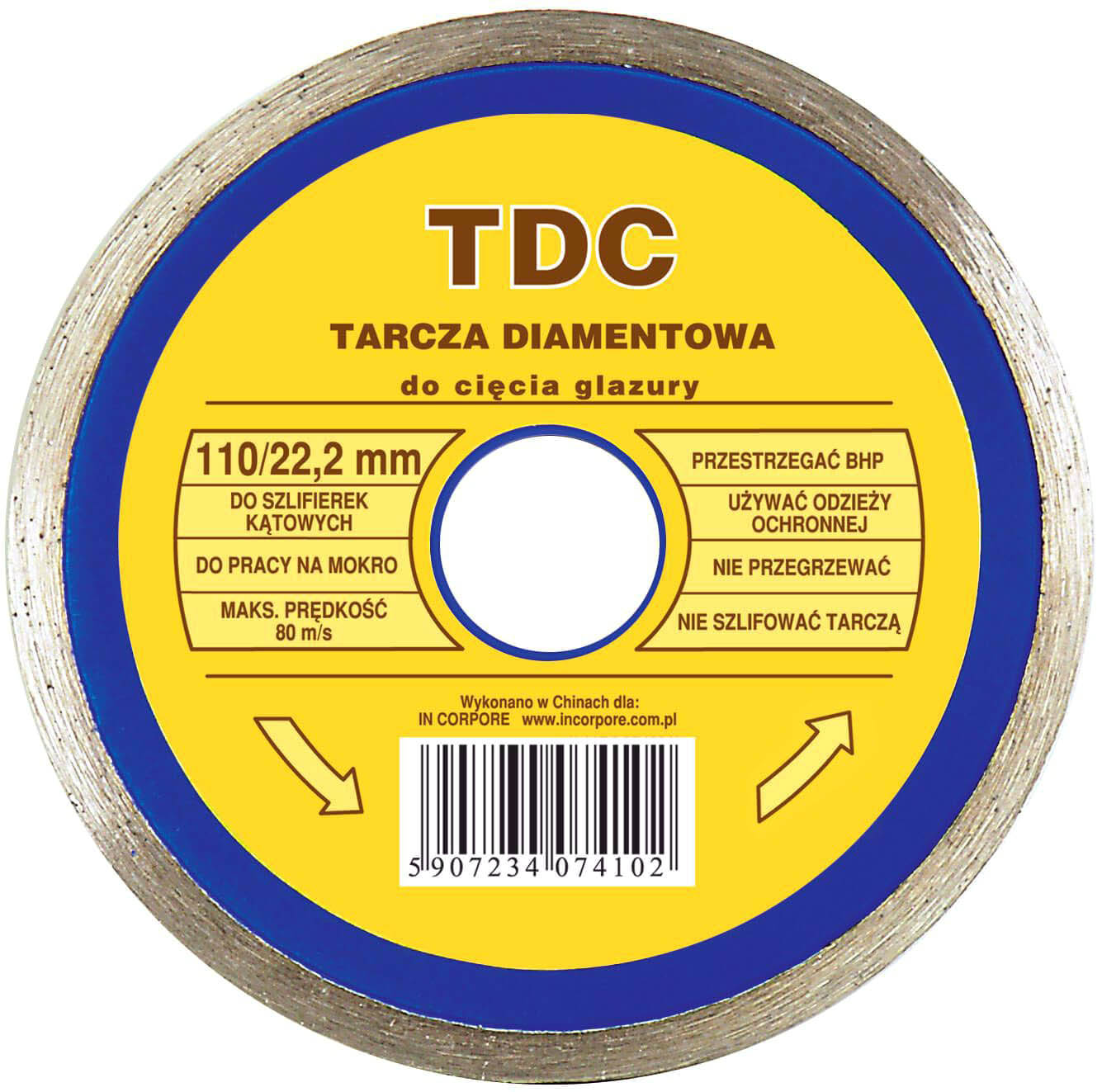 Tarcza diamentowa TDC o średnicy 110mm z obwodem zamkniętym. Przeznaczona do cięcia glazury na mokro za pomocą szlifierki kątowej. W przypadku cięcia na sucho producent zaleca częste przerwy dla schłodzenia tarczy.