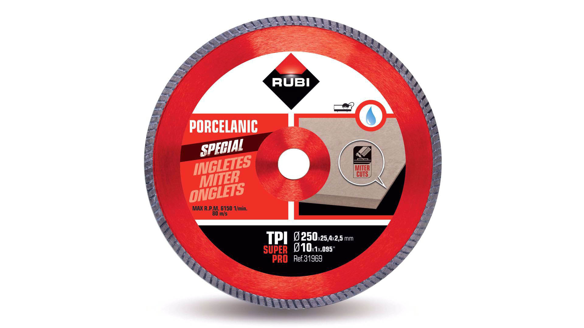 Tarcza diamentowa turbo serii TPI została specjalnie zaprojetkowana do cięcia płytek gresowych pod kątem. Główne cechy charakteryzujące tę tarczę to duża stabilność i szybkość cięcia.Dysk tarczy ma 2,5 mm grubości, dzięki czemu można ją stosować do ukosowania bez konieczności używania specjalnych talerzy usztywniających, choć oczywiście ich zastosowanie może pomóc w uzyskaniu największej precycji.W przypadku tarczy TPI zastosowano obrzeże typu TURBO, które wymaga poprowadzenia linii cięcia ok.1-2 mm poniżej oryginalnej krawędzi płytki, by nie naruszyć warstwy glazurowanej.Obrzeże diamentowe jest mocowane do metalowego dysku techniką spawania laserowego zapewniającą największą trwałość i bezpieczeństwo użytkowania.Chcąc uzyskać maksymalną wydajność z tarczy TPI zaleca się cykliczne stosowanie bloczka do czyszczenia tarcz diamentowych. Osełkę do tarcz można zastosować przed pierwszym użyciem, a zaleca się szczególnie po dłuższym okresie nieużywania tarczy, w przypadku zmiany ciętego materiału lub zauważenia znacznego ograniczenia prędkości cięcia. Prawidłowe stosowanie bloczka do ostrzenia polega na jego wielokrotnym nacinaniu.W swojej ofercie RUBI posiada tarcze o dwóch jakościach: PRO i SUPERPRO.Tarcze PRO zapewniają najlepszy stosunek jakości do ceny.Tarcze SUPERPRO nadają się do najbardziej wymagających prac.Zalecane jest stosowanie tarczy TPI wyłącznie na przecinarkach elektrycznych wyposażonych w specjalną osłonę stosowaną do tarcz z obrzeżem innym niż ciągłe.