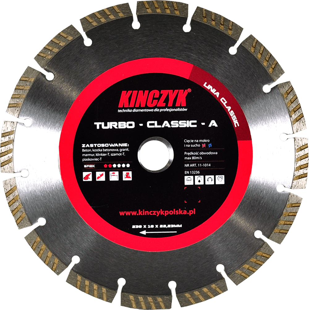 Tarcza TURBO CLASSIC-A o średnicy 115mm, z diamentem syntetycznym, gwarantuje wysoką wydajność i wyjątkowo szybkie cięcie. Sprawdzi się do pracy zarówno na mokro jak i na sucho. Tarcza producenta Kińczyk jest spiekana bezpośrednio na dysk, co pozwala na całkowite zużycie segmentu. Niezależenie od sposobu mocownia wydajność cięcia jest określona poprzez jakość diamentu syntetycznego i spoiwa. Umożliwia pracę ze szlifierkami kątowymi, piłami stołowymi, spalinowymi piłami ręcznymi i szczeliniarkami.