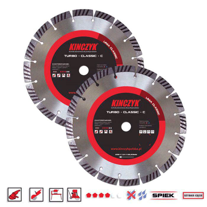 Tarcza diamentowa TURBO CLASSIC C o średnicy 230mm gwarantuje wysoką wydajność i wyjątkowo szybkie cięcie. Sprawdzi się do pracy zarówno na mokro jak i na sucho. Tarcza producenta Kińczyk jest spiekana bezpośrednio na dysk, co pozwala na całkowite zużycie segmentu. Umożliwia pracę ze szlifierkami kątowymi, piłami stołowymi, spalinowymi piłami ręcznymi oraz szczeliniarkami.